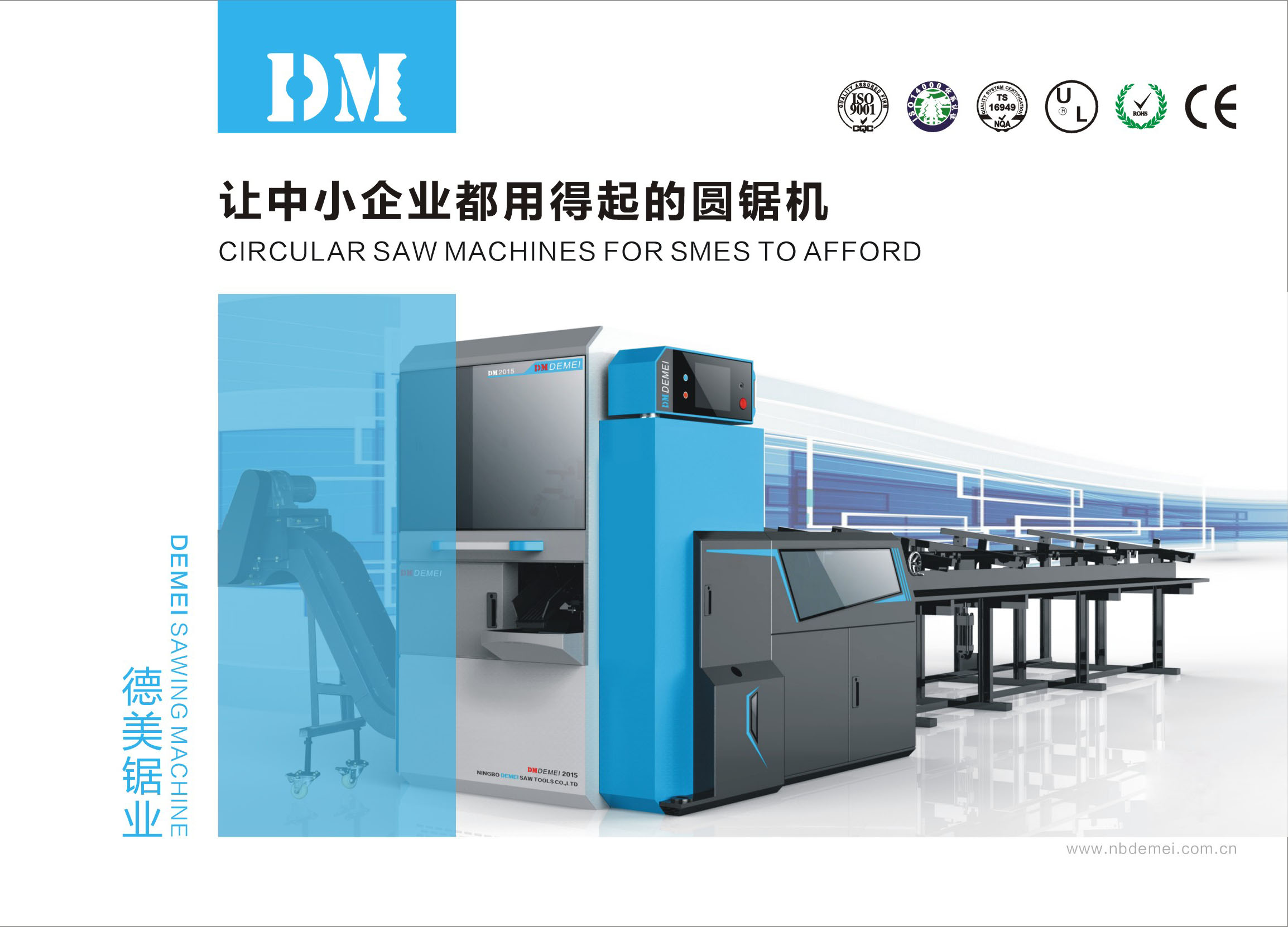 德厚物美、诚信第一、技术至上是宁波德美的真实写照! 我们坚持“以高尚人品打造行业精品,凭技术创新铸就世界品牌”的企业理念,立志打造一个最专业的金属冷锯切装备制造基地!宁波德美,从来以铸造精品、不断创新为己任,立志以己绵薄之力助力民族工业的腾飞。本公司坐落于东海之滨,长江三角洲南翼之历史文化名城宁波,距离以“东方大港”之称称誉国内外的北仑港仅10余里, 交通便利、环境优美。是一家专业研发、制造金属冷锯切成套设备解决方案的新兴高新技术型生产企业,自主研发生产的全自动泛用型高速金属圆锯机等金属加工装备广泛用于国家重点支持的航空航天、核能、机电、船舶、汽车等领域。德美出品,必属精品。主要产品有HSS及TCT高速切管机、高速切棒机、各种全(半)自动有色金属切割机等,并针对客户特殊需求提供从来料到成品的一条龙解决方案,另承接各种进口锯切设备机构及控制改造。设厂至今,没有任何困难能阻挡我们,在攻克一个又一个技术难关之后我们比以往更自信更坚定,但同时又严苛地自我期望生产技术能日益精进,不断地求新、求精,凝聚专业的研发团队,创造广大中国企业能用得起的尖端产品。因为有德美,您的工厂从此多了一种选择;只要您愿意,您可一步登天,将世界最先进的技术握在手中!