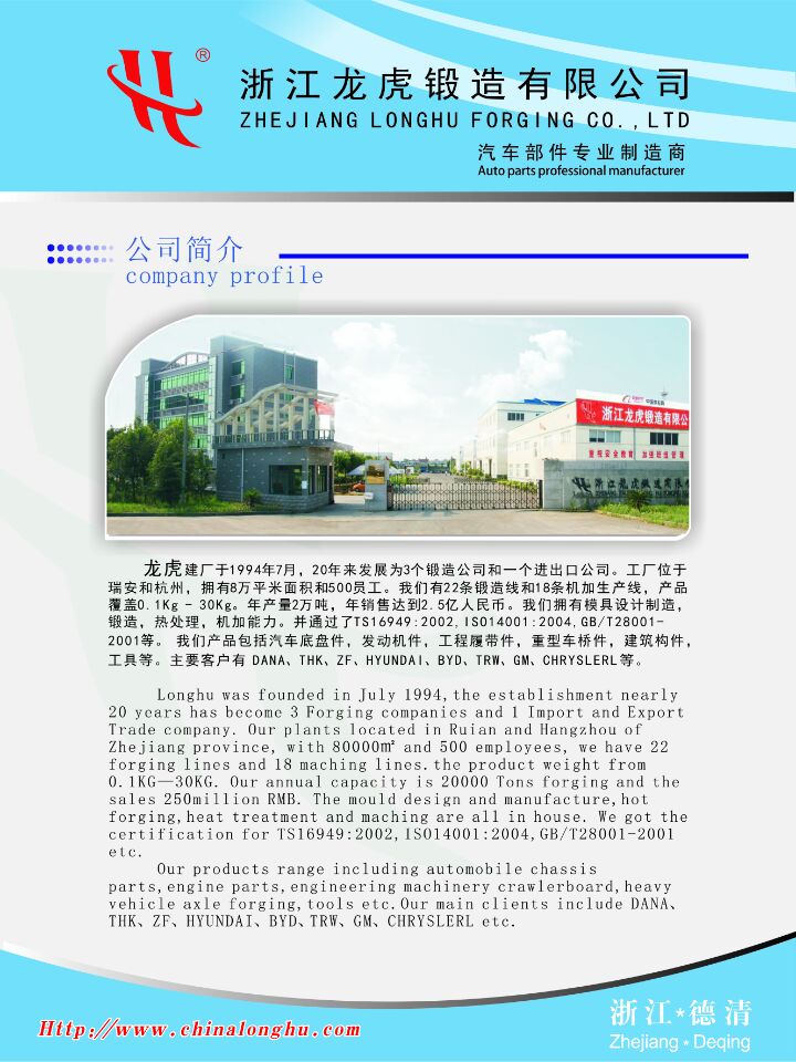 龙虎公司创立于1994年,其前身是瑞安龙虎锻造厂,经过十余年的拼搏和奋斗,目前已拥有浙江龙虎锻造公司、瑞安龙虎锻造公司、瑞安龙虎电气公司、德清进出口贸易公司等四个公司,成为我国制造业中专业从事汽车零件锻造及机械加工的知名企业之一。公司总部坐落于风景秀美人杰地灵的莫干山畔,德清县干山工业区55号,距杭州萧山国际机场仅1小时车程,距上海或者宁波港仅2小时左右车程,左邻宁杭高速铁路德清站,地理位置优越、物流交通便利。公司拥有一批高中级技术职称为骨干的技术、管理人才和一支具有拼搏进取、团结、协作精神的优秀员工队伍,公司拥有专业锻造生产线15条,年锻造生产能力2万吨,产品及模具设计均采用CAD/CAM技术,公司设有以机械加工中心及数控机床为主要设备的机械加工车间和以连续炉为主要设备的热处理车间,以及专业的模具制造车间,公司拥有检验和实验手段完善的质量检测中心。公司专业生产汽车配件、工程机械、五金工具及建筑构件等四大类。各机型产品1000余种,主导产品有:12T-18T平台车车轮轴头、凸轮轴、制动器支架、凸轮轴支架、转向节、半轴突缘、汽车悬挂、拉杆、发动机汽门摇臂、汽车门铰链及锚件、吊环等。产品不仅销往国内各知名主机企业,在海外如德国、美国哥伦比亚、韩国、新加坡、泰国印度和台湾等地也拥有广泛的用户。公司拥有完善、可靠的质量保障体系、和完备的用户服务体系,并先后通过了ISO9002;QS9000;ISO/TS16949;ISO14000/18000等体系认证工作。公司全体员工牢固树立了“用户的需要就是我们的标准”的理念,愿以自己的优良产品和优质的工作为更加广泛的用户,提供竭诚周到的服务。