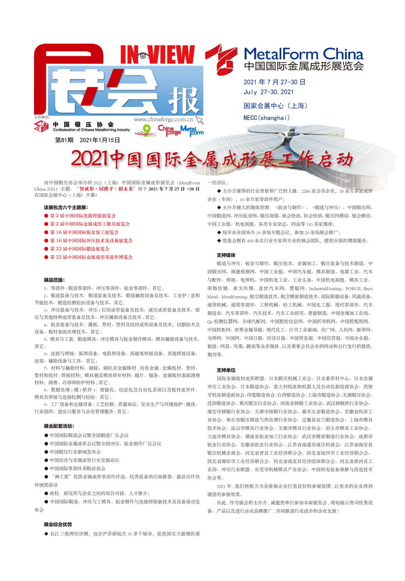 中国国际金属成形展览会,由中国锻压协会始创于1990年的北京锻造展和金属零部件博览会,与创办于2004年的上海冲压展和钣金展,于2007年在北京合并而成。其中,锻造展是世界唯一单独举办的专业展览会,展示规模和水平很高;冲压和钣金制作展,是世界七大同类专业名展之一,是国内唯一的全国性冲压和钣金加工专业展!