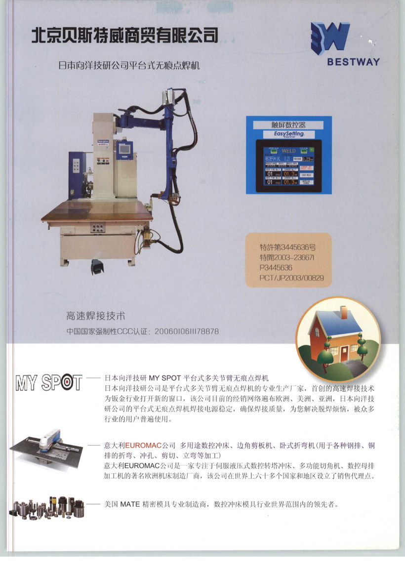 日本向洋技研MY SPOT 平台式多关节臂无痕点焊机日本向洋技研公司是平台式多关节臂无痕点焊机的专业生产厂家,首创的高速焊接技术为钣金行业打开新的窗口,该公司目前的经销网络遍布欧洲、美洲、亚洲,日本向洋技研公司的平台式无痕点焊机焊接电源稳定,确保焊接质量,为您解决脱焊烦恼,被众多行业的用户普遍使用。意大利EUROMAC公司多用途数控冲床、边角剪板机、卧式折弯机(用于各种钢排、铜