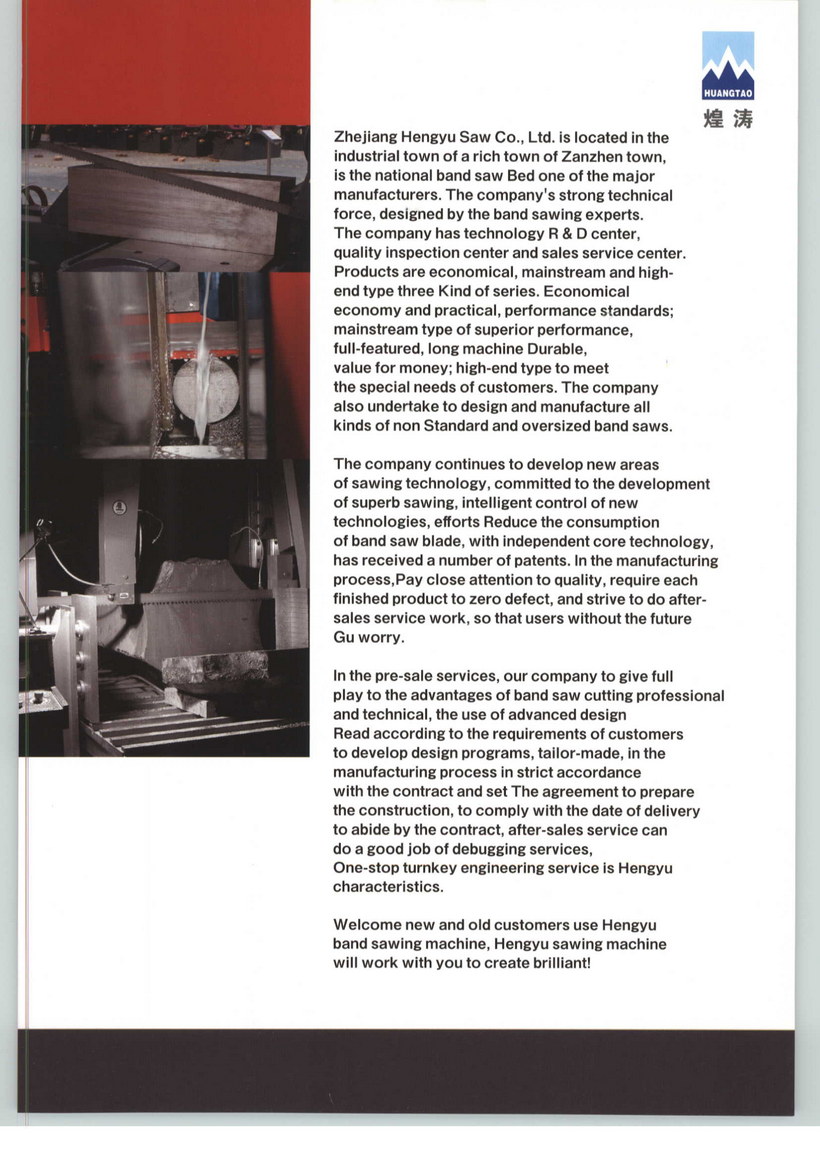 浙江恒宇锯床有限公司(浙江天帆机械有限公司)座落在工业强镇盛产带锯床之乡的壶镇,是全国带锯床主要制造商。 本公司的技术力量雄厚,由带锯床专家治厂,公司有技术研发中心,质量检测中心和销售服务中心。产品有经济型、主流型和高端型三种系列:经济型经济实用,性能达标;主流型性能优越,功能齐 全,机床经久耐用,物超所值;高端型能满足客户特殊需求。本公司还承接设计制造各种非标准和 超大型带锯床。