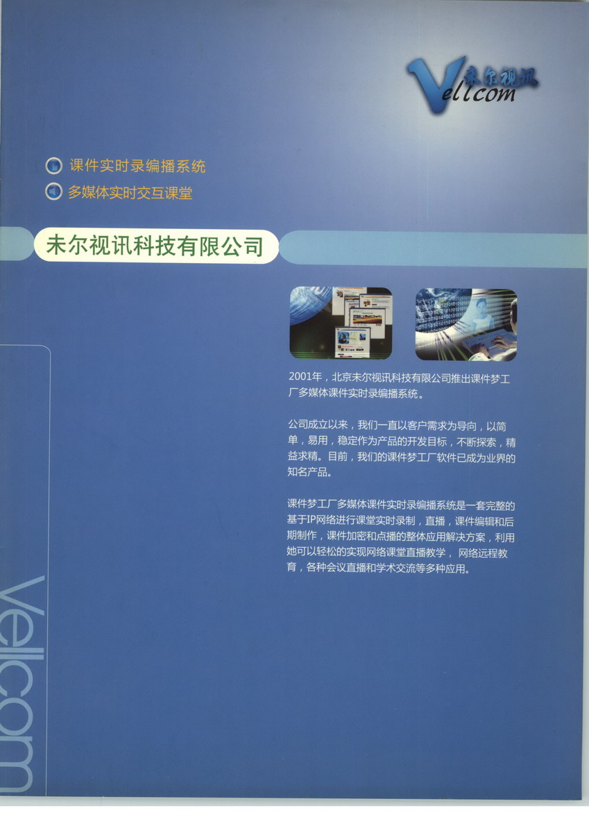 北京未尔视讯科技有限公司(Beijing Vellcom Technology Co. ,Ltd )成立于2002年,位于北京市海淀区上地中关村国家留学创业园,是由美国硅谷留学科研人员创办的具有自主知识产权的高新技术企业,专业致力于手持移动终端的软硬件设计,多媒体通信软件及图像处理技术的研究开发和销售,公司所有员工均拥有大学以上学历,研发人员主要来自清华大学,技术带头人为多媒体和移动通信领域的留美博士,有多年的海外工作经历和产品研发经验,公司强大的技术研发团队,为公司研发一流产品提供了强有力的技术保障。公司产品包括手持终端移动考勤系统,课件梦工厂工具软件系列、实时互动直播课堂系统、资源管理系统、数字版权管理系统等。我们的用户遍及全国各地并已经开始进入海外市场,国内成功的用户包括国家发改委,中国海关,中国银行,国家质监总局,中国移动通信公司,北京大学、清华大学、中国人民大学、北京航空航天大学、北京师范大学、中山大学、西北工业大学等各类用户群体。