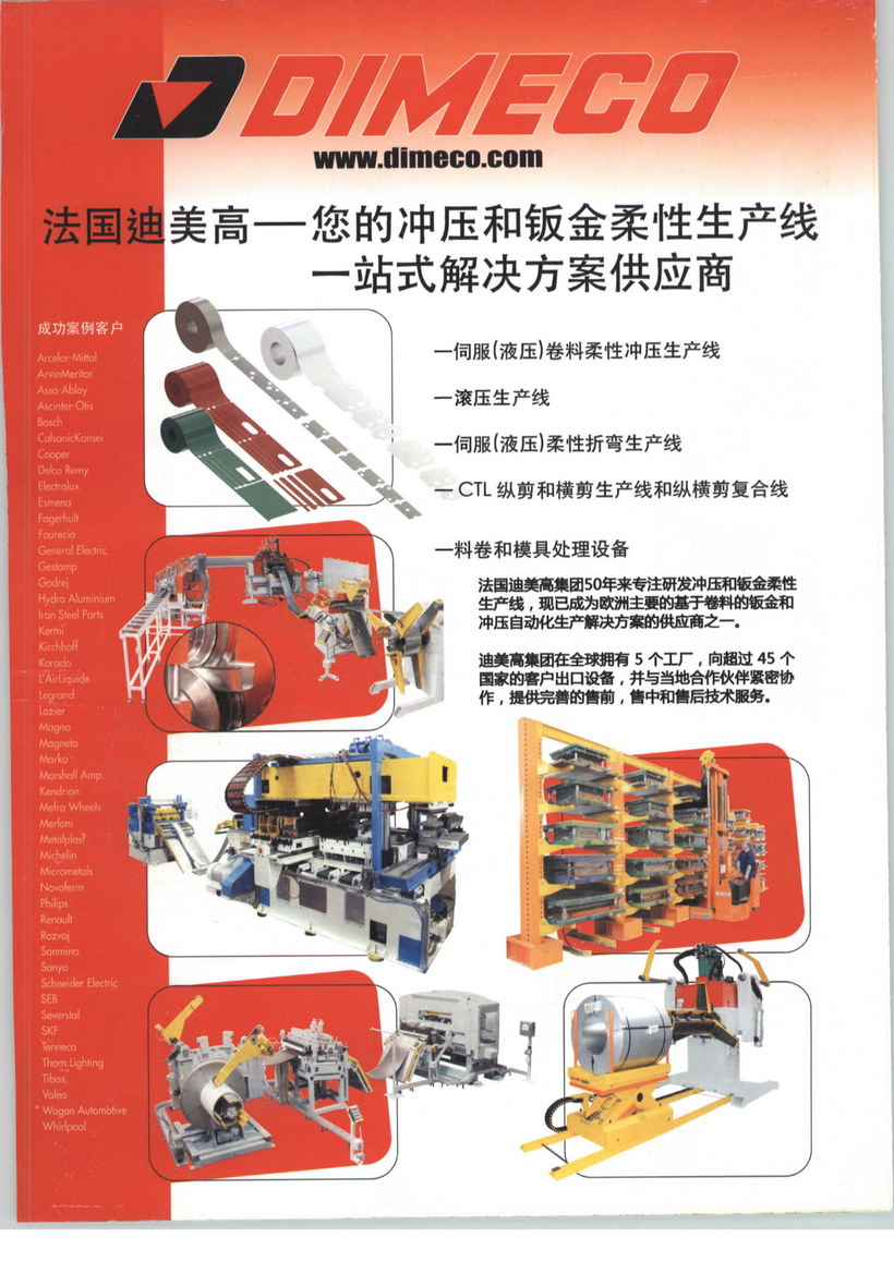法国迪美高集团50年来专注研发冲压和钣金柔性生产线,现已成为欧洲主要的基于卷料的钣金和冲压自动化生产解决方案的供应商之一。迪美高集团在全球拥有5个工厂,向超过45个国家的客户出口设备,并与当地合作伙伴紧密协作,提供完善的售前,售中和售后技术服务。