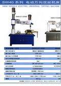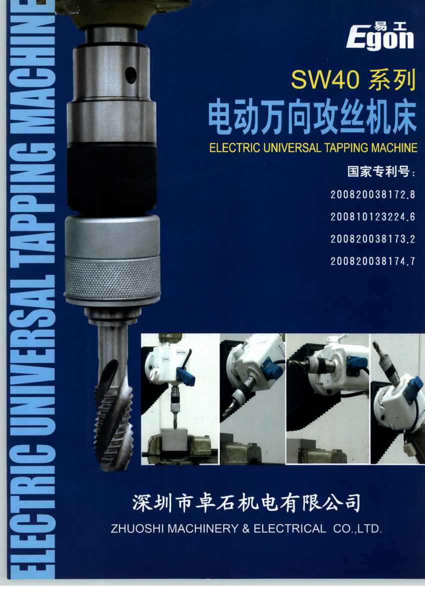 本公司是生产电动万向攻丝机床的,产品用途广泛,能对钢、铸铁、铝、铜等各种材料进行攻丝,适用于各类机械加工制造行业。工作效率高,一天可完成手工50天的工作量;灵活性强,可实现万向攻丝,垂直、水平、侧向,360度均能攻丝;动力装置及丝锥夹筒带双重保护确保不会损坏丝锥,同时攻丝过程承受力均衡,螺牙加工精度高。大机型:SW40-27-1200范围在M4-M34,小机型:SW40-16-800范围在M4-M20