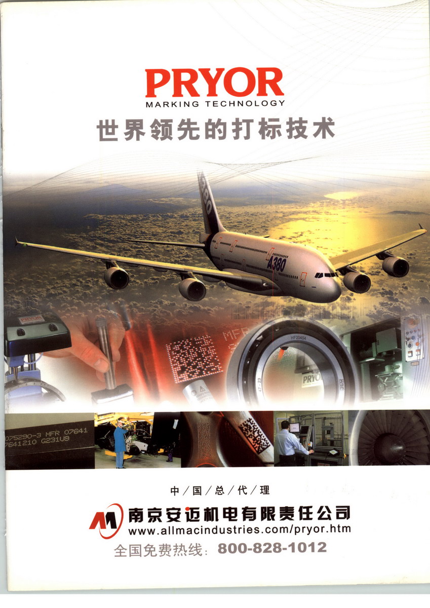 南京安迈机电有限责任公司是英国PRYOR 打标机产品在中国的总代理,专业销售钢字模,冲头,各类便携式打标机,工业/车间用点阵打标机,激光打标机,电腐蚀打标机系列产品,并提供二维码在工业零件表面打标与识别的解决方案。我公司已成功为国内多家航空业制造商提供了多套从二维码打标到二维码识别的打标系统,深受用户好评。