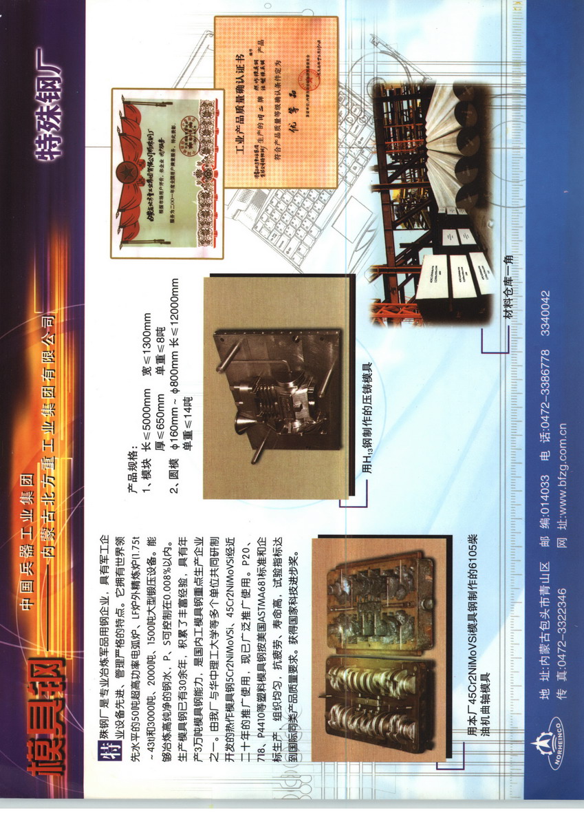 特殊钢厂是北方重工集团下属的一个分厂,占地面积51268.6平方米,固定资产5亿元,在集团公司生产经营中占有举足轻重的地位。经过五十多年的建设和发展,特殊钢厂已成为集冶炼、炉外精炼、电渣重熔、锻造、机械加工、热处理和无损检测于一体的综合性特种钢大型锻件毛坯生产厂家,具有可年产各种碳结钢、合结钢、轴承钢、工模具钢、轧辊钢、高压容器钢、机车车轴用钢以及高强韧专用钢20万吨、大型锻件5万吨的生产能力。
