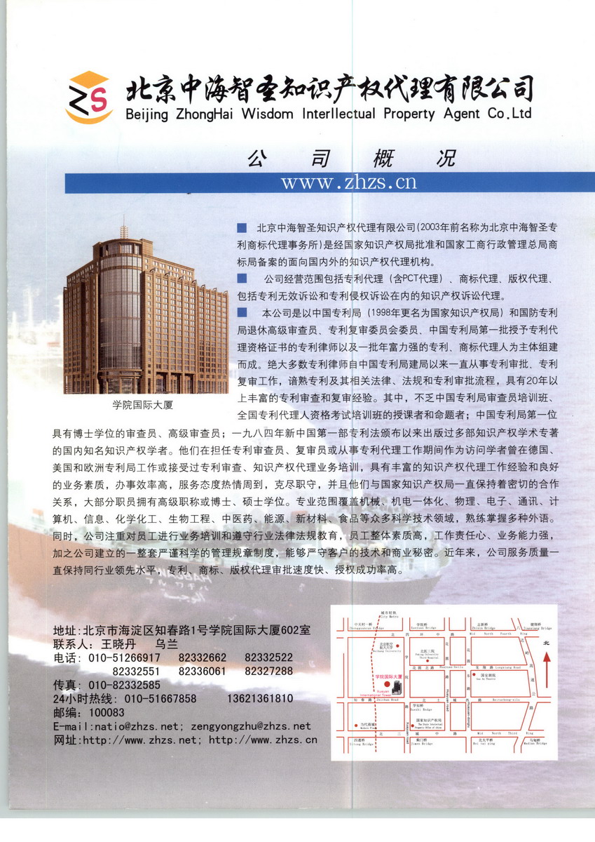 北京中海智圣知识产权代理有限公司是经国家知识产权局批准和国家工商行政管理总局商标局备案,成立于2003年面向国内外的知识产权涉外代理机构。公司董事长兼总经理曾永珠博士,国内知名知识产权专家,在中国专利局(现为国家知识产权局)和国防专利局工作20多年,先后担任专利审查员、高级专利审查员、专利复审委员会委员、国防专利局局长等职务,是中国专利局和国防专利局第一位具有博士学历与学位的专利审查员、高级专利审查员。自1985年以来,出版《实用专利全书》等专利领域学术专著6部,发表有关知识产权等方面学术论文100余篇。曾博士是近年来国内重大知识产权诉讼要案之一、举国关注的“天下第一刀”专利权人在北京市高级人民法院终判决审理中委托的律师团首席发言人,为专利权人的专利在国家知识产权局复审委员会和北京市第一中级人民法院被判决无效的颇为不利的情况下赢得了高院终审胜诉,在国内产生重大影响。近年来,公司代理的诸多知识产权纠纷案件中,以曾博士为首知识产权专家、专利律师,在诉讼中表现出的深厚的法律功底、宽广的专业技术知识和雄辩的口才受到国内外委托人的赞誉。