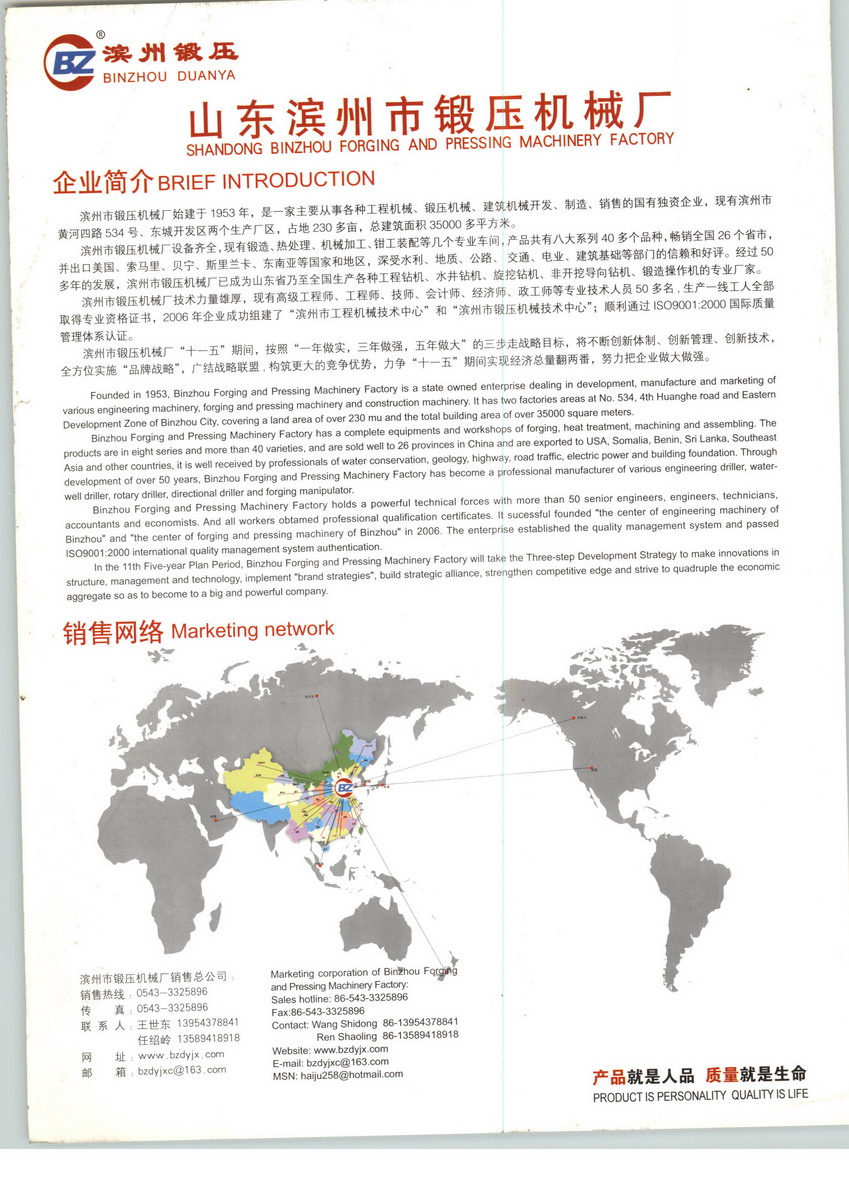 滨州市锻压机械厂设备齐全,现有锻造、热处理、 机械加工、焊接、装配等几个专业车间,产品共有十大系列150多个品种,畅销全国26个省市,深受水利、地质、公路、 交通、电业、建筑基础等部门和单位的信赖和好评,并出口孟加拉国、索马里、贝宁、斯里兰卡、东南亚等国家和地区。经过50多年的发展,滨州市锻压机械厂已发展成为山东省乃至全国生产各种工程钻机、水井钻机、旋挖钻机、非开挖导向钻机、锻造操作机的专业厂家。