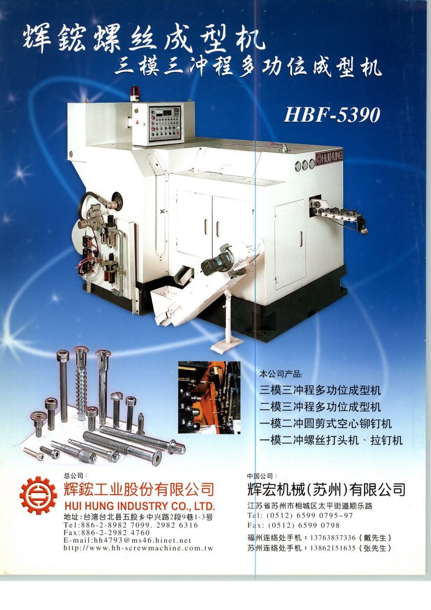 总公司辉鋐工业股份有限公司于1981年成立于台湾省台北县,其生产设备先进、制造技术雄厚、检测设备完善,是一家集科研、开发、制造、销售、服务为一体的专业螺丝机械制造企业。本公司主要从事螺丝打头机、多工位螺丝成型机(二模三冲、三模三冲、四模四冲)、铆钉机、拉钉机及圆切式空心铆钉机的研发、制造,并可根据客户要求,提供从产品设计、设备配套制造、整厂设备安装、调试、人员培训等一系列服务。