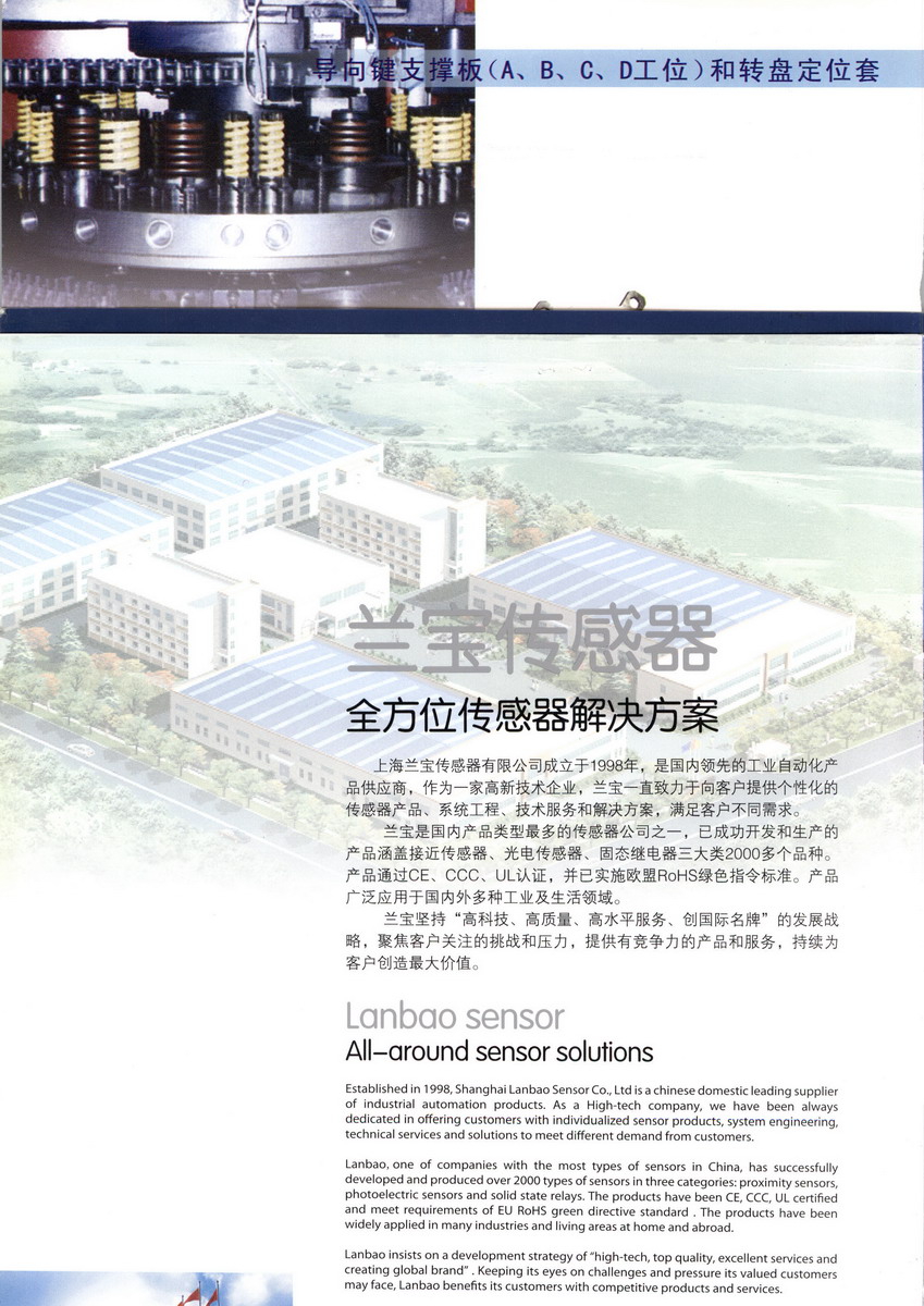 兰宝传感科技股份有限公司主要业务为工业测控传感器的研发、生产、销售及应用,为客户提供标准化和定制化的工业测控传感器及工业测控传感系统。产品系列已通过CCC认证、CE认证、UL认证和ISO9001:2008质量管理体系认证,并已实施欧盟RoHS环保指令,主要包括电感式传感器、光电式传感器、电容式传感器和陶瓷厚膜压力传感器等三十多个系列、3000余种规格型号。各项产品技术性能居行业领先地位,其中多个系列产品达到国际先进水平。兰宝依托自身技术优势为客户定制符合需求的工业测控传感系统。