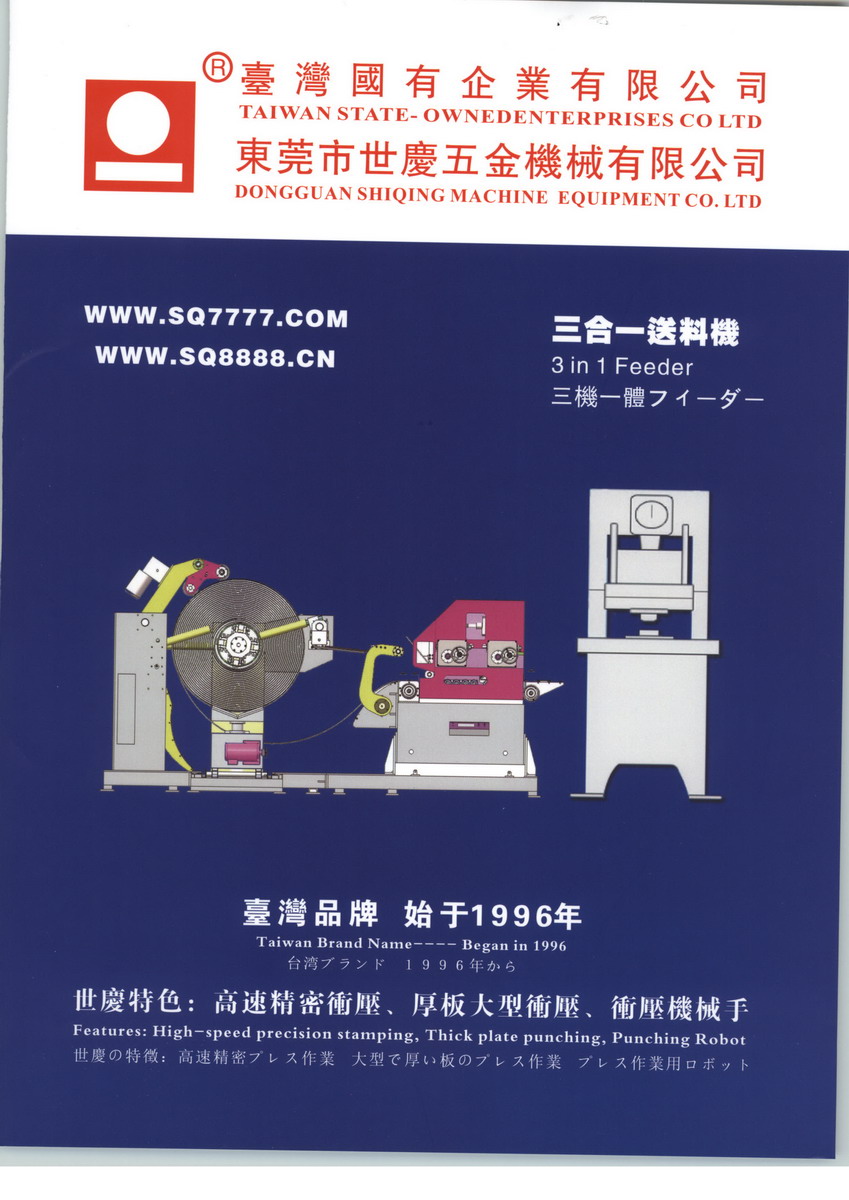 东莞市世庆五金机械有限公司总公司位于世界制作之都东莞,是台湾老牌冲压周边厂家,全球知名品牌之一,也是全球产品种类最齐全的生产厂家之一。于1996年在东莞设立的大陆地区总部,参考先进国家技术,专业生产与销售冲床周边自动化系列的机械设备以及整厂设备。