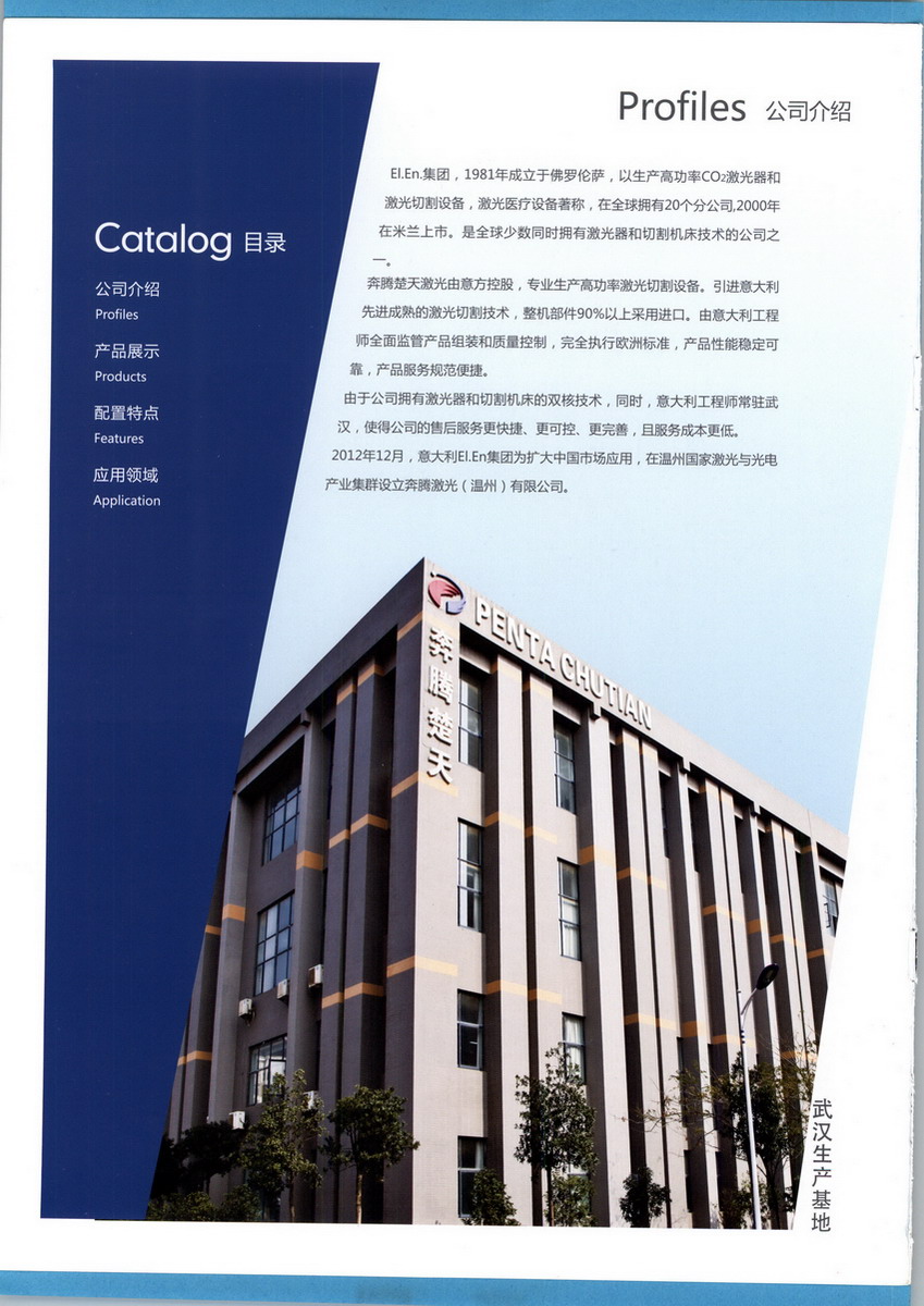 奔腾激光(温州)有限公司是由意大利El.En集团与武汉楚天激光集团合资组建,由意方控股和提供技术支持,专业生产高功率激光切割焊接设备的高科技企业。