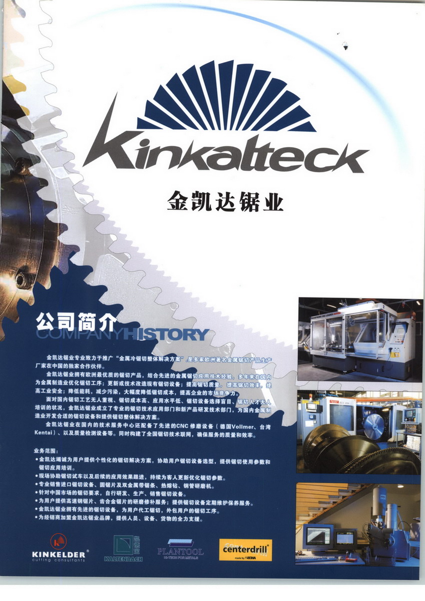 金凯达锯业(KINKALTECK) 是一家专业致力于推广“金属冷锯切成套设备解决方案”的服务型企业。代理国外著名金属锯切设备,钢管钢棒加工机械和金属切割产品;经营进口金属圆锯片、不锈钢锯片、高速钢圆锯片、双金属带锯条、高速圆锯机、圆盘锯、切管机、研磨机、抛光机、热钻、切铝机、切断机、磨齿机、带锯机、锯床等,并提供锯切设备维护及金属切割技术咨询服务。