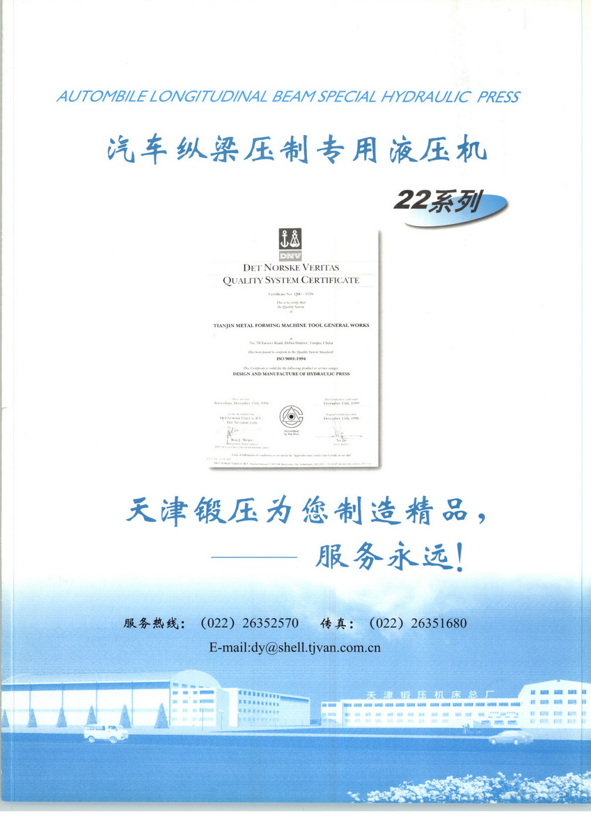 天津市锻压机床总厂是我国起步最早的企业,现有固定资产2.4亿元各类专业技术人员480人,是机戒部大型骨干企业。自我厂自行设计国内第一台液压机,开创了我国中小型液压机生产历史以来,目前拥有26个系列,300余品种,产品从80KN至5000KN,以形成年产1200台各类液压机的生产能力,居国内同行业之首。1983年YT32-315四柱液压机获国家银牌,1990年YT32-630/1030双动力拉伸液压机一举荣获同行业唯一的国家金奖另有部优产品3项,市优产品5项。产品广泛适用于汽车制造、粉末冶金、金属冷挤、轻工家电、化工机戒、航空航天、模具磨料、机戒制造等行业,被国家指定为替代进口产品,行销全国,产品出口到日本、荷兰、东南亚等20多个地区和国家、市场占有率居全国同行业第一。另有部优产品3项,市优产品5项。产品广泛适用于汽车制造、粉末冶金、金属冷挤、轻工家电、化工机戒、航空航天、模具磨料、机戒制造等行业,被国家指定为替代进口产品,行销全国,产品出口到日本、荷兰、东南亚等20多个地区和国家、市场占有率居全国同行业第一。作为机戒部科技进步示范企业,充分发挥全国唯一的液压机研究所设在我厂的技术优势,在带领液压行业提高技术水平的同时,以快速的科技进步适应市场,采用CAD工作站和CAM计算机辅助设计,率先在国内成功的采用了比例控制技术、位置数字控制技术、同步控制技术、触摸屏技术等先进技术,使产品技术水平一直处于国内领先地位。