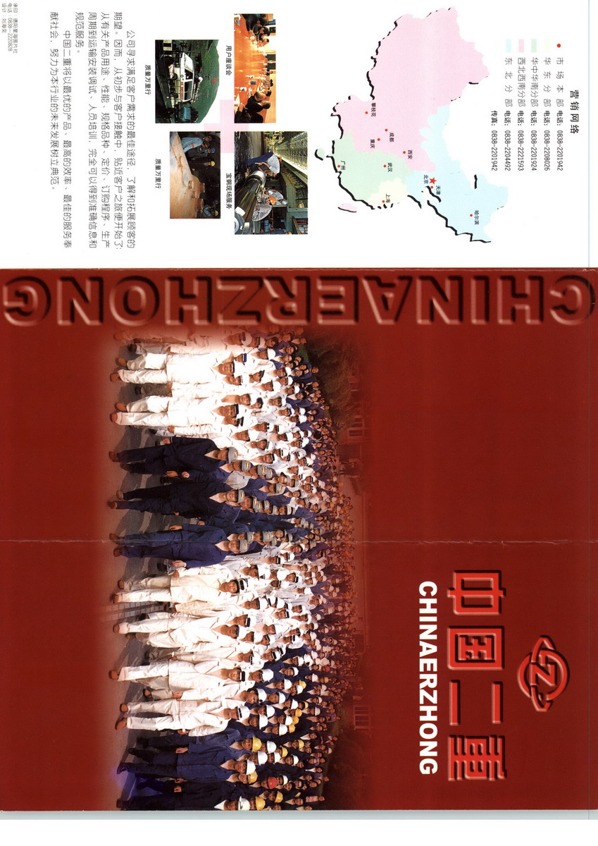 中国第二重型机械集团公司(简称中国二重)始建于1958年,是中国最大的重大技术装备研制基地之一,是关系国家安全、关系国民经济命脉的基础性、战略性企业。为了做强做大做优企业,探索我国重型装备制造业发展的新路,2013年,经国务院批准,中国二重与国机集团实施联合重组,中国二重整体产权无偿划入国机集团,中国二重成为国机集团全资子企业。重组后,中国二重将依托国机集团28所国家级研究院所和70多家海外服务机构,遍布140多个国家的国际市场营销网络,形成强大的产品研发、制造能力,工程总包、系统集成能力,贸易与服务能力,成为中国高端重型装备企业。中国二重具有强大的产品研发、设计和制造能力,旗下有国家级技术中心、工程实验室和博士后工作站,有以当今世界最大的800MN模锻压机、160MN自由锻压机为代表的生产设备6600余台,具备一次性冶炼1000t钢水、浇注600t钢锭、产出550t成品铸件及400t成品锻件的能力,可按国际、国内标准及不同等级、规格和用户需求提供冶金成套设备、核电、水电、火电成套铸锻件、重型压力容器、大型传动件、大型航空模锻件等各类重大技术装备制造服务。五十多年来,中国二重先后为冶金、矿山、能源、交通、汽车、石油化工、航空航天等国民经济各部门和国防建设提供了两百多万吨重大技术装备,积淀了深厚的技术实力和服务经验,在国家重大技术装备国产化的进程中发挥了不可替代的重要作用。在党的十八大和中央历次全会精神指导下,中国二重将牢固树立和践行创新、协调、绿色、开放、共享的发展理念,紧紧围绕“一年有新突破、三年有大变化、五年上新台阶,建设一个市场化、现代化、国际化的新二重”的战略目标,加快推进企业转型升级、振兴发展,加快构建集科、工、贸于一体的高端重型装备制造平台,为我国从制造大国走向制造强国作出新的更大贡献。1958年10月13日下午 2时,四万多人聚集在城南广阔的田野上,到处充满节日气氛的喧天锣鼓声,西南重机厂(1960年更名为“第二重型机器厂”)首任厂长景晓村在开工典礼上剪彩后,来自四川省、成都市、绵阳地委、德阳工业区、德阳县的有关领导、来宾、建厂人员和数万民工一同挥镐破土,拉开了二重正式建厂的序幕。 1958年10月14日,《四川日报》在头版头条发布消息:“目前规模我国最大、 将来产品世界称雄”。1959年,中央工作会议确定中国二重列为当年的国家重点建设项目之一, 中国二重初期建厂进入全面开工阶段。经过1961年至1963年以维护为中心的缓建时期,1964年至1966年大打歼灭战的缓建时期, 中国二重主要生产车间的土建已基本完成, 水压机、 电炉、钢清、减速器、 一号、四号、五号、铸铁、锻压等九个车间进入设备安装阶段。