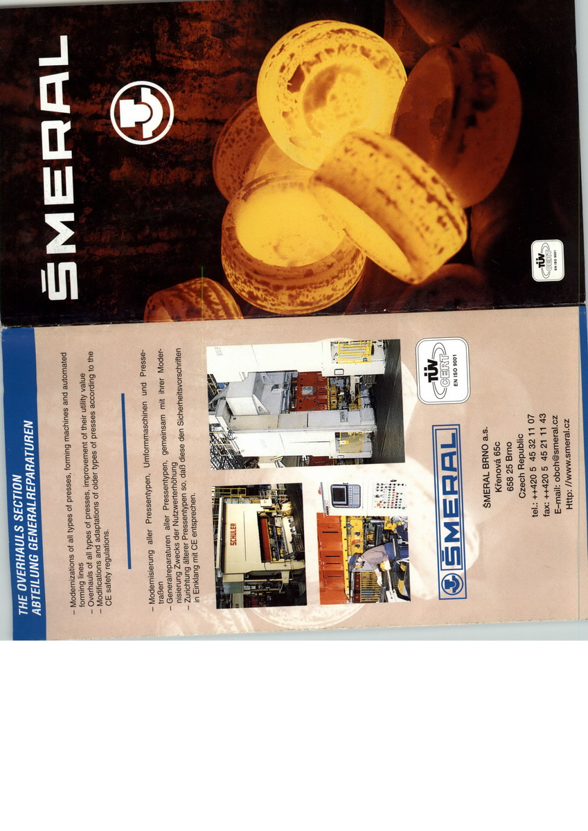 The Company has its own design-development base which is able to keep in touch with the world development of forming machines. The company annually invests in expanding its production capacities. Besides satisfying customer demand for expansion of types of the produced machines, company Smeral Brno strives to equip machines by service or supporting automation equipment to reduce service times, which leads to increased productivity for the machines end-users and to improvement of diagnostics of the produced machines and change to the machines controlled by electronic control systems. Smeral Brno is also able to make provisions to fulfil individual demands and needs of customers in machines design.All commercial activities of the company are currently provided by our own staff with co-operation with foreign partners in individual territories. The company has staff able to communicate in English, German, Russian and Polish for the smooth running of production and commercial activities.Our company is certified by TüV NORD for management system as per EN ISO 9001:2008 and EN ISO 14001:2004.We meet the requirements for production management system and welding processes, conformity assessment, certification, manufacture and installation of steel parts, components, assemblies and structures in accordance with EN 1090-1:2009 + A1:2011, EN 1090-2 + A1:2012 and EN ISO 3834-2:2006.Our testing laboratory has the right to use the stamp of Testing laboratory with acknowledged activity by SČZL.
