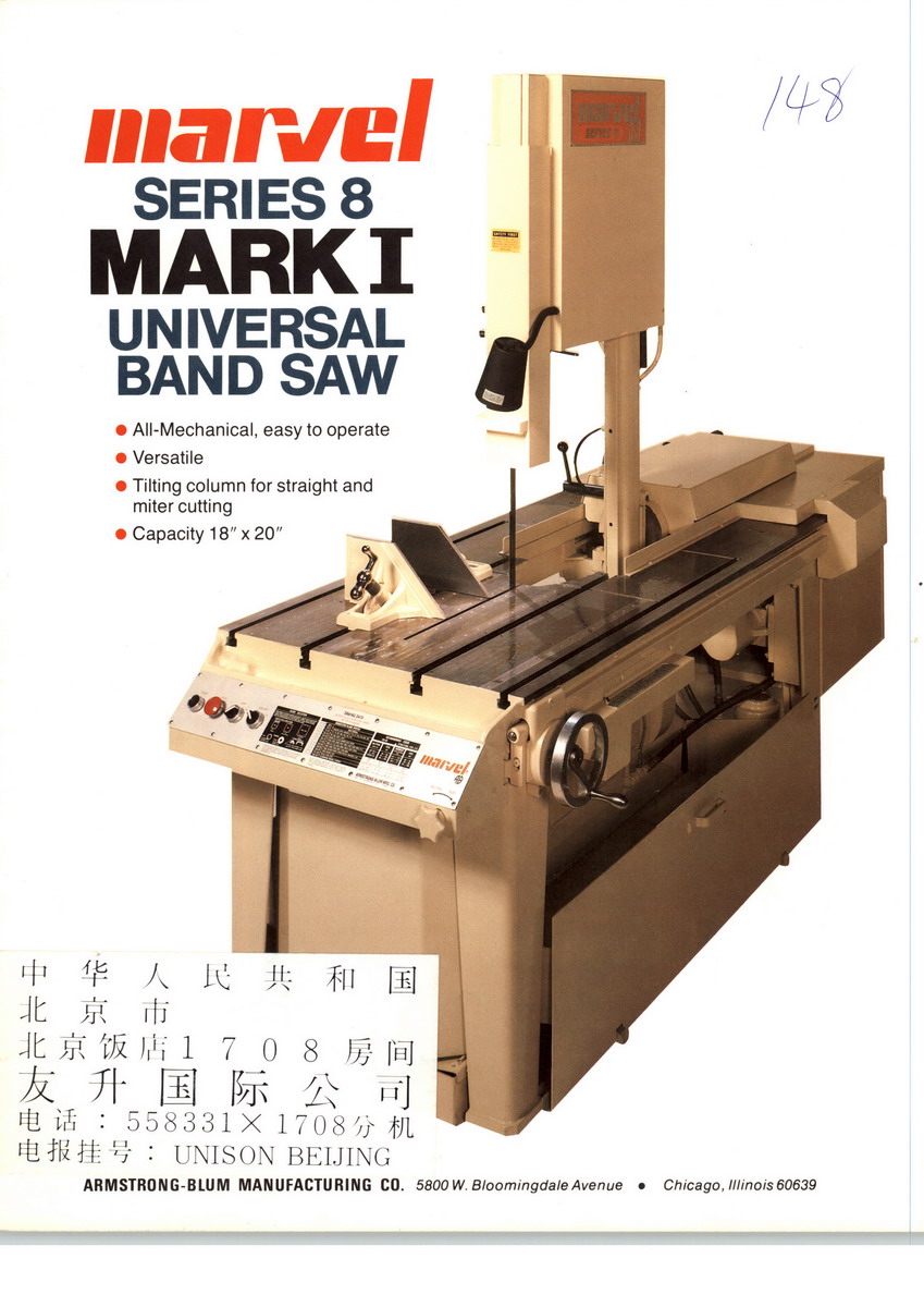 Marvel Manufacturing Company, Inc. offers a complete line of metal cutting saws and ironworkers under our MARVEL and SPARTAN trademarks. Marvel introduced the first vertical tilt-frame band saw in 1917 and remains the leader in the vertical tilt frame market. Our Marvel line of vertical saws ranges from the single cut universal Series 8 to our fully automatic programmable Touch Tech models with miter cutting up to 60 degrees. Our Spartan band saw line features both hinge and dual column band saw designs in capacities from 12 to 60 inches as well as a complete line of plate saws and contour saws. The Spartan brand name also includes high production thin kerf carbide circular saws and our Spartan Ironworkers which are available in capacities from 50 to 180 tons.