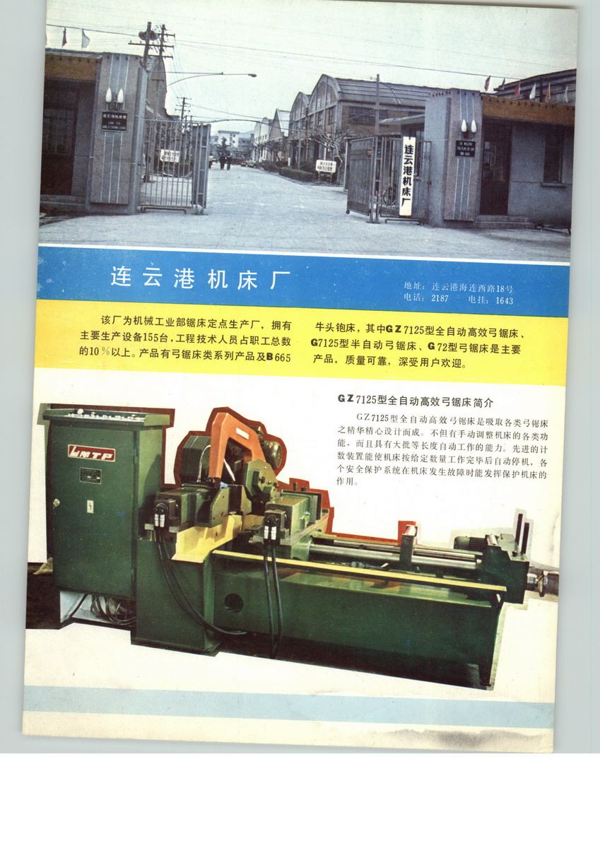连云港机床厂有限公司(原连云港机床厂)位于黄海之滨、新亚欧大陆桥东桥头堡、美丽的港口城市-连云港市。连云港机床厂有限公司创建于1967年2月。2.1万平方米的占地面积,1.45万平方米的厂房建筑,150余台套高精度的生产设备,使其拥有年产3000余台套各类金属锯床的生产能力。优美的环境,便捷的交通,特殊的地理位置,加上优秀的加工,使得连云港机床厂有限公司充满朝气。1994年,我厂与日本天田株式会社合资兴建了天田连云港机械有限公司,注册资金620万美元,主要产品为AMADAΦ250系列带锯床、双金属带锯条,产品质量挤身世界一流。经过三十余年的努力与奋斗,公司已发展成为中国规模最大的锯削装备的生产基地,2002年名列中国机床工具行业企业效绩评比综合得分第一。主要产品有Φ160--500mm全系列卧式弓锯床及Φ250--1300mm全系列带锯床。“连机”弓锯床、带锯床被授于江苏省名牌产品称号,连续多年被国家质量技术监督局抽查为合格产品。公司近四十余年的生产经验,加上完美的ISO9000质量管理体系,必将使广大顾客的需求得到最大的满足,并与广大顾客共创美好的明天 。