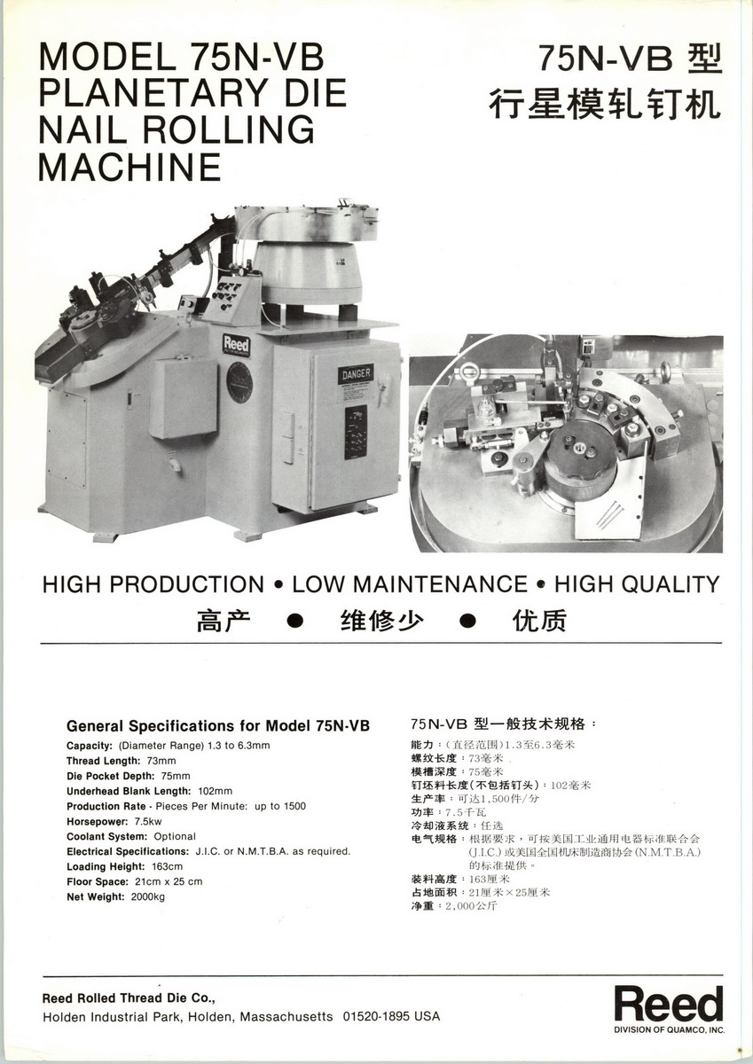 A through feed thread rolling die for rolling external threads on a cylindrical work piece has an external thread thereon with relieved starting and finishing sections, the starting relief providing flat crests which form a predetermined angle with the roll axis and taper to a diameter at the starting end less than the mean height of the fully formed threads. A modified version tapers the starting section at a larger angle than the predetermined angle of the crests thereby reducing the length of the starting section. The invention includes the method of metal movement caused by the die in the formation of the thread.