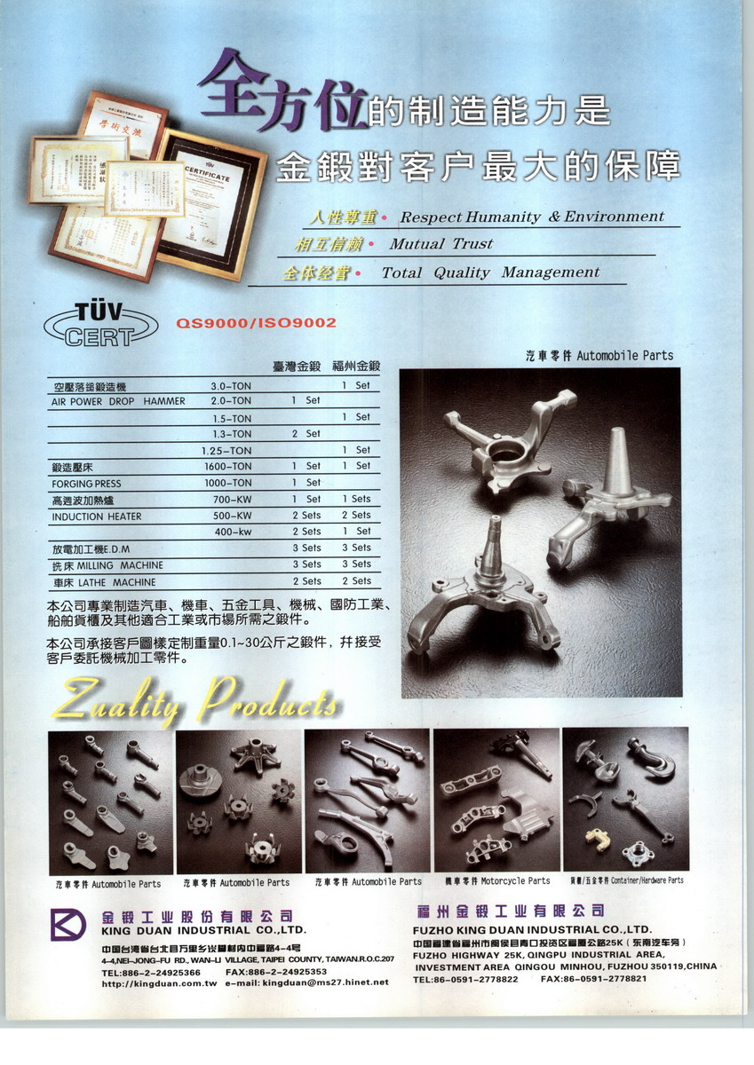 金锻工业股份有限公司于1985年在台湾成立,目前员工270人,产能1500T/月,产值1400万美金/年。主要生产汽车、摩托车及各式机械五金热锻件,品质通过QS-9000认证。本公司于2001年12月独资,在中国福州青口东南汽车城设立“福州金锻工业有限公司”注册资本590.9万美元,总投资1015.5万美金。主要业务是承制中国汽车OEM锻造件及外销欧美、日本锻件,因在台湾有20年经验及汽车保安件和各式钢材锻件的实绩,现并投资有模具研发制作、锻件制作、热处理加工一贯作业,服务高质量客户,以最好的质量、交期、价格及服务,满足客户需求。