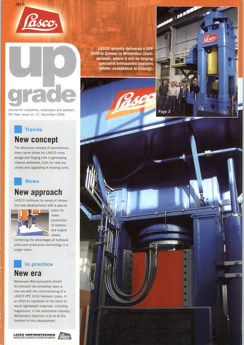 自从Langenstein和Schemann 1863年在德国科堡创立LASCO开始。LASCO就致力于在军事、航天航空、汽车、船舶、化工、医疗、采矿和建筑工业领域为用户提供最具现代化、最经济的锻压及成型设备生产线,LASCO产品以其高效率、高质量和不断创新而久负盛名。LASCO一向遵循市场的要求,不仅专注于锻造及板材成型领域,LASCO设备在粉末冶金等特殊工业也广泛应用。同时,在建筑新型墙体材料领域,LASCO设备及生产线也早已得到客户的广泛认可。