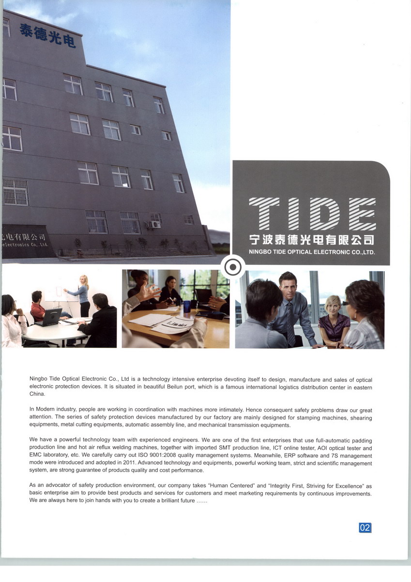 宁波泰德光电有限公司是专业从事光电保护装置设计、生产和销售的科技型企业,坐落于美丽的东方大港北仑,是新兴的国际物流集散中心现代化的工业企业中,人与机器更加密切的协同工作,安全问题随之更加受到重视。我司生产的安全保护装置主要适用于冲压机械、剪切设备、金属切削设备、自动化装配线、机械传送搬运设备等。 我司拥有一支强大的科技团队,技术精湛,经验丰富,持续创新。我司率先在行业内引进全自动贴片生产线和完善的检测老化设备,并拥有进口SMT生产线,ICT在线测试仪,AOI光学测试仪,EMC实验室等。公司认真贯彻ISO9001:2008质量认证体系,2011年引进ERP软件,并全面推行“7S”管理模式。先进的技术和设备,强大的科技团队,严格的科学管理制度,是我司对高性价比产品的保证。 作为安全生产环境的维护者,我司本着“以人为本”的设计理念,“诚信第一,追求卓越”的企业宗旨,努力向客户提供最好的产品,并通过持续改进,不断适应和满足市场。同时,我们争取用最好的服务来满足客户,感动客户。我司殷切希望与您一起,携手并进,创造更美好的明天。