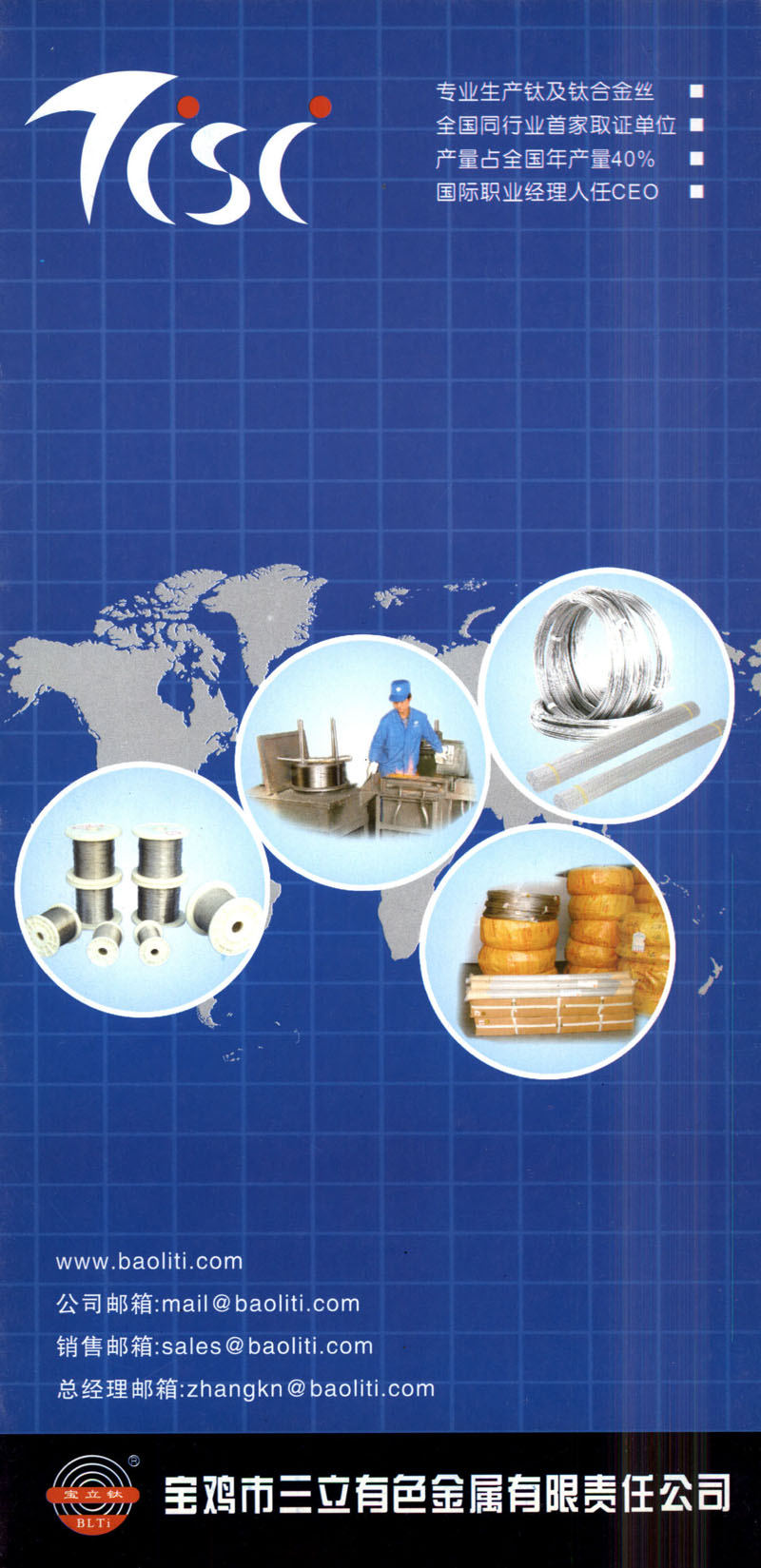 宝鸡市三立有色金属有限责任公司是钛及钛合金(钛丝、医用钛材、钛棒、钛弹簧)、丝材、棒材、板材、管材、专业生产著名厂家,注册商标“宝立钛”,又是有色金属生产、加工、销售、贸易、研发为一体的现代化专业生产厂家。