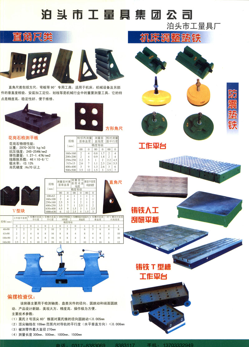 第三类工量具产品有:大型铸铁平台、检验平板、划线平台、组合平台、矿山、冶金机械配件、电梯导轨、脱硫箱、焦炉铸铁、直立炉铁件、铸铁塔等产品,产品远销全国20余个省、市、自治区,并将产品推出国门行销国外十余个国家,赢得了国内外客户的一致好评。