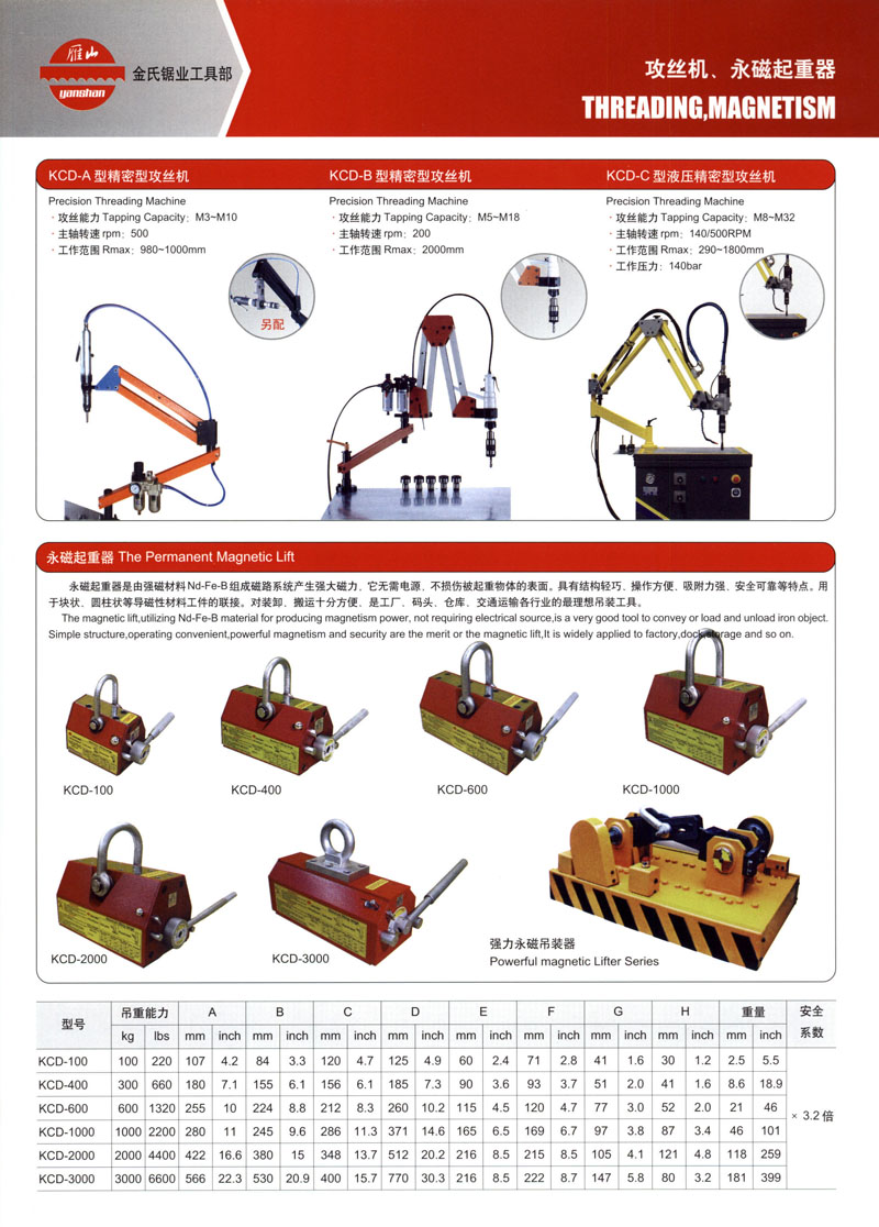 公司致力于企业发展,技术进步,引进国外先进制造技术开发的卧式、立式带锯床,钨钢带锯条,倒角机,气动攻丝机,永磁起重器,具有科技含量高、高效节能、结构合理、质量稳定等特点。广泛应用于黑色、有色金属、塑料及非金属材料的锯切。产品畅销国内外,深受用户信赖。我公司同时也承接特大规格型号锯床的设计制造。
