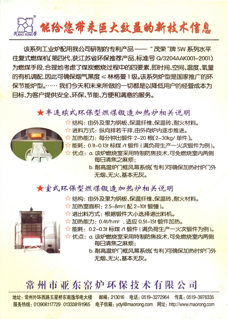 本公司是中国锻造协会会员、江苏省环境保护产业协会会员,市民营科技协会会员,多年重合同守信用单位,是专业化的环保节能技术开发公司,产品获得多项国家专利。