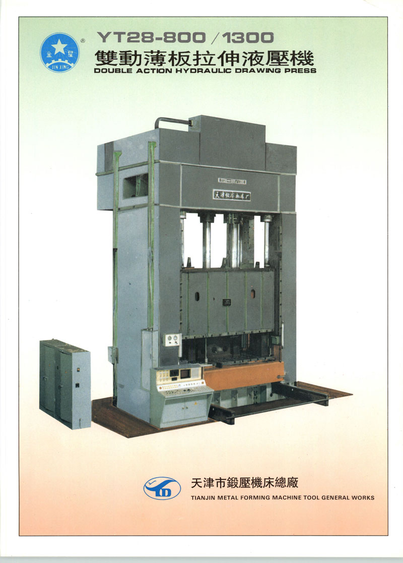 天津市锻压机床总厂是我国起步最早的企业,现有固定资产2.4亿元各类专业技术人员480人,是机械部大型骨干企业。自我厂自行设计国内第一台液压机,开创了我国中小型液压机生产历史以来,目前拥有26个系列,300余品种,产品从80KN至5000KN,以形成年产1200台各类液压机的生产能力,居国内同行业之首。1983年YT32-315四柱液压机获国家银牌,1990年YT32-630/1030双动力拉伸液压机一举荣获同行业唯一的国家金奖另有部优产品3项,市优产品5项。产品广泛适用于汽车制造、粉末冶金、金属冷挤、轻工家电、化工机戒、航空航天、模具磨料、机戒制造等行业,被国家指定为替代进口产品,行销全国,产品出口到日本、荷兰、东南亚等20多个地区和国家、市场占有率居全国同行业第一。