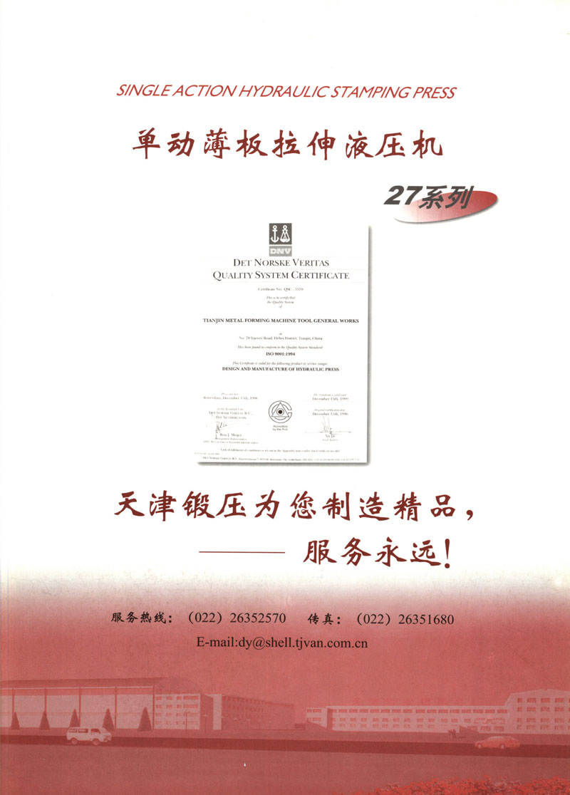 天津市锻压机床总厂是我国起步最早的企业,现有固定资产2.4亿元各类专业技术人员480人,是机械部大型骨干企业。自我厂自行设计国内第一台液压机,开创了我国中小型液压机生产历史以来,目前拥有26个系列,300余品种,产品从80KN至5000KN,以形成年产1200台各类液压机的生产能力,居国内同行业之首。1983年YT32-315四柱液压机获国家银牌,1990年YT32-630/1030双动力拉伸液压机一举荣获同行业唯一的国家金奖另有部优产品3项,市优产品5项。产品广泛适用于汽车制造、粉末冶金、金属冷挤、轻工家电、化工机戒、航空航天、模具磨料、机戒制造等行业,被国家指定为替代进口产品,行销全国,产品出口到日本、荷兰、东南亚等20多个地区和国家、市场占有率居全国同行业第一。