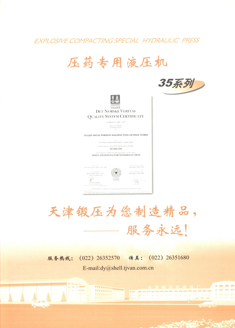 天津市锻压机床总厂是我国起步最早的企业,现有固定资产2.4亿元各类专业技术人员480人,是机械部大型骨干企业。自我厂自行设计国内第一台液压机,开创了我国中小型液压机生产历史以来,目前拥有26个系列,300余品种,产品从80KN至5000KN,以形成年产1200台各类液压机的生产能力,居国内同行业之首。1983年YT32-315四柱液压机获国家银牌,1990年YT32-630/1030双动力拉伸液压机一举荣获同行业唯一的国家金奖另有部优产品3项,市优产品5项。产品广泛适用于汽车制造、粉末冶金、金属冷挤、轻工家电、化工机戒、航空航天、模具磨料、机戒制造等行业,被国家指定为替代进口产品,行销全国,产品出口到日本、荷兰、东南亚等20多个地区和国家、市场占有率居全国同行业第一。