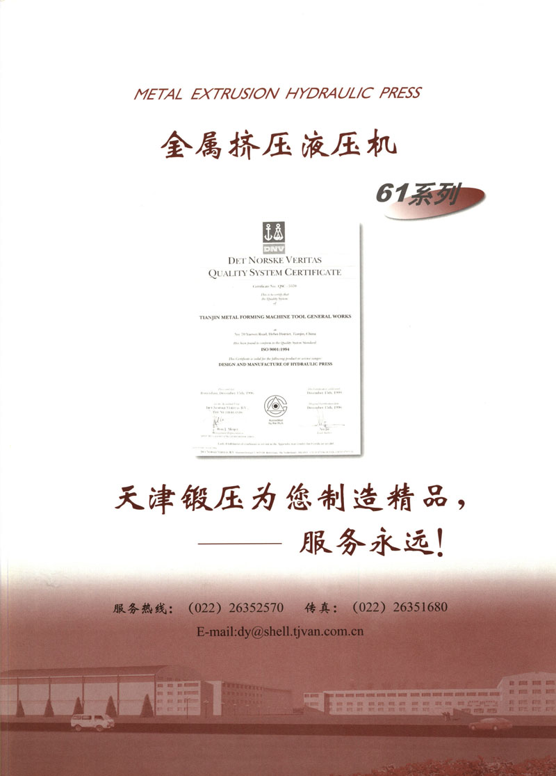 天津市锻压机床总厂是我国起步最早的企业,现有固定资产2.4亿元各类专业技术人员480人,是机械部大型骨干企业。自我厂自行设计国内第一台液压机,开创了我国中小型液压机生产历史以来,目前拥有26个系列,300余品种,产品从80KN至5000KN,以形成年产1200台各类液压机的生产能力,居国内同行业之首。1983年YT32-315四柱液压机获国家银牌,1990年YT32-630/1030双动力拉伸液压机一举荣获同行业唯一的国家金奖另有部优产品3项,市优产品5项。产品广泛适用于汽车制造、粉末冶金、金属冷挤、轻工家电、化工机戒、航空航天、模具磨料、机戒制造等行业,被国家指定为替代进口产品,行销全国,产品出口到日本、荷兰、东南亚等20多个地区和国家、市场占有率居全国同行业第一。