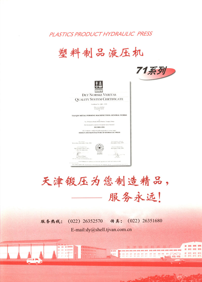 天津市锻压机床总厂是我国起步最早的企业,现有固定资产2.4亿元各类专业技术人员480人,是机械部大型骨干企业。自我厂自行设计国内第一台液压机,开创了我国中小型液压机生产历史以来,目前拥有26个系列,300余品种,产品从80KN至5000KN,以形成年产1200台各类液压机的生产能力,居国内同行业之首。1983年YT32-315四柱液压机获国家银牌,1990年YT32-630/1030双动力拉伸液压机一举荣获同行业唯一的国家金奖另有部优产品3项,市优产品5项。产品广泛适用于汽车制造、粉末冶金、金属冷挤、轻工家电、化工机戒、航空航天、模具磨料、机戒制造等行业,被国家指定为替代进口产品,行销全国,产品出口到日本、荷兰、东南亚等20多个地区和国家、市场占有率居全国同行业第一。