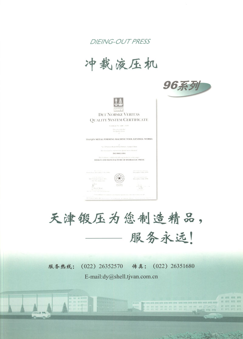 天津市锻压机床总厂是我国起步最早的企业,现有固定资产2.4亿元各类专业技术人员480人,是机械部大型骨干企业。自我厂自行设计国内第一台液压机,开创了我国中小型液压机生产历史以来,目前拥有26个系列,300余品种,产品从80KN至5000KN,以形成年产1200台各类液压机的生产能力,居国内同行业之首。1983年YT32-315四柱液压机获国家银牌,1990年YT32-630/1030双动力拉伸液压机一举荣获同行业唯一的国家金奖另有部优产品3项,市优产品5项。产品广泛适用于汽车制造、粉末冶金、金属冷挤、轻工家电、化工机戒、航空航天、模具磨料、机戒制造等行业,被国家指定为替代进口产品,行销全国,产品出口到日本、荷兰、东南亚等20多个地区和国家、市场占有率居全国同行业第一。