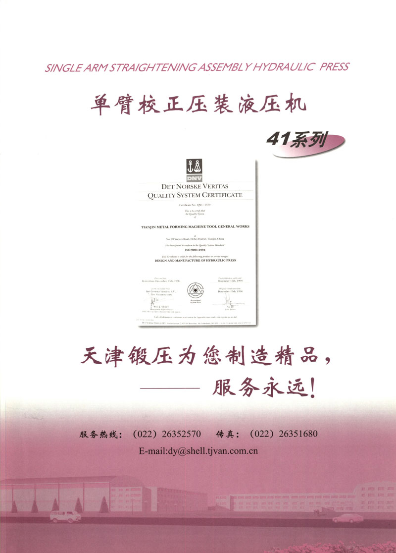 天津市锻压机床总厂是我国起步最早的企业,现有固定资产2.4亿元各类专业技术人员480人,是机械部大型骨干企业。自我厂自行设计国内第一台液压机,开创了我国中小型液压机生产历史以来,目前拥有26个系列,300余品种,产品从80KN至5000KN,以形成年产1200台各类液压机的生产能力,居国内同行业之首。1983年YT32-315四柱液压机获国家银牌,1990年YT32-630/1030双动力拉伸液压机一举荣获同行业唯一的国家金奖另有部优产品3项,市优产品5项。产品广泛适用于汽车制造、粉末冶金、金属冷挤、轻工家电、化工机戒、航空航天、模具磨料、机戒制造等行业,被国家指定为替代进口产品,行销全国,产品出口到日本、荷兰、东南亚等20多个地区和国家、市场占有率居全国同行业第一。