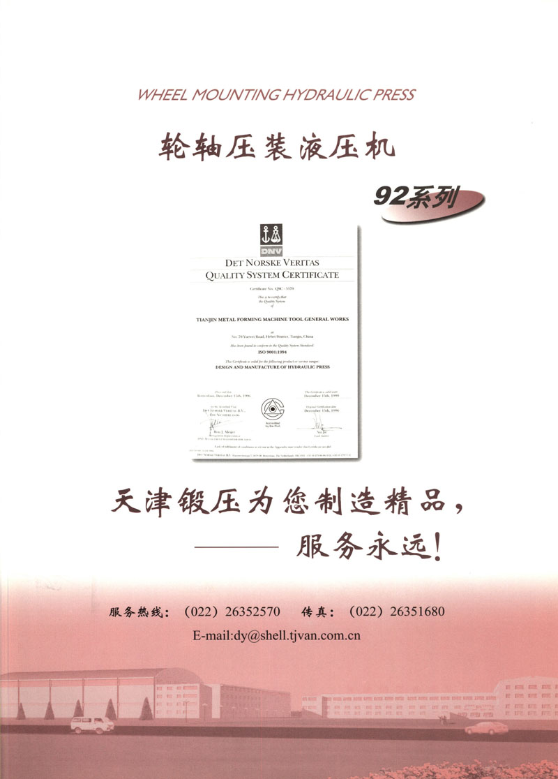 天津市锻压机床总厂是我国起步最早的企业,现有固定资产2.4亿元各类专业技术人员480人,是机械部大型骨干企业。自我厂自行设计国内第一台液压机,开创了我国中小型液压机生产历史以来,目前拥有26个系列,300余品种,产品从80KN至5000KN,以形成年产1200台各类液压机的生产能力,居国内同行业之首。1983年YT32-315四柱液压机获国家银牌,1990年YT32-630/1030双动力拉伸液压机一举荣获同行业唯一的国家金奖另有部优产品3项,市优产品5项。产品广泛适用于汽车制造、粉末冶金、金属冷挤、轻工家电、化工机戒、航空航天、模具磨料、机戒制造等行业,被国家指定为替代进口产品,行销全国,产品出口到日本、荷兰、东南亚等20多个地区和国家、市场占有率居全国同行业第一。