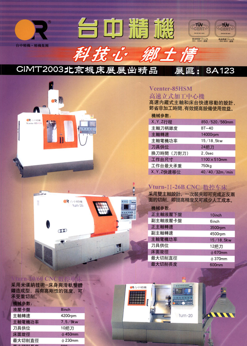 台中精机成立于1954年,以所谓『黑手业』的传统工作母机起家。草创时期由故董事长黄奇煌、李道东常董及黄德金常董三位于台中〝草尾仔埕〞向人承租4坪大的屋檐为厂房,主要生产牛头刨床及皮带式车床等。走过近一甲子的岁月,台中精机在黄明和总经理的带领下,本着「一地研发、两地生产、全球营销」的经营策略,建立起两岸七大制造基地,全球八大营销服务中心版图。从传统走向高科技精密产业,秉持质量至上、服务第一理念,迈向「华人圈精密机械第一品牌」。