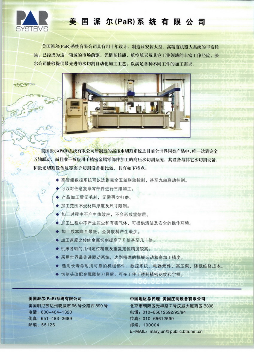 PaR公司是一家在各行业遥控处理设备方面,具有40年经验,在龙门式机械手方面处于领先地位的厂家,既可提供标准设备,还可以根据用户的应用来制造。PaR公司已在全球设计、制造了1000套以上的机械手系统。工业用机械手包括核工业自动加料系统、环境工程、原料处理、机械手等,广泛应用于船舶、航天和重工业系统,以及水切割设备。