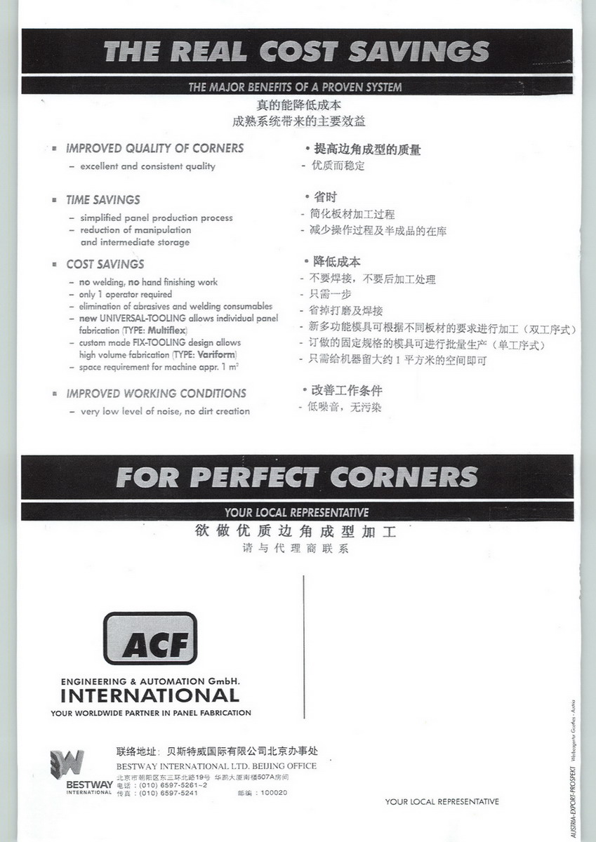 我公司是意大利EUROMAC公司、日本向洋技研在中国设立的总代理商。意大利EUROMAC公司是一家专注于液压数控转塔冲床、多功能切角机、数控多功能折弯机的著名欧洲机床制造厂商,该公司在世界上六十多个国家和地区设立了销售代理点;日本向洋技研公司是平台式多关节臂无痕点焊机的专业生产厂家,该公司目前的经销网络遍布欧洲、美洲、亚洲,日本向洋技研公司的平台式无痕点焊为用户提供了完美的焊接质量,目前在中国国内已有上百家用户正在使用。