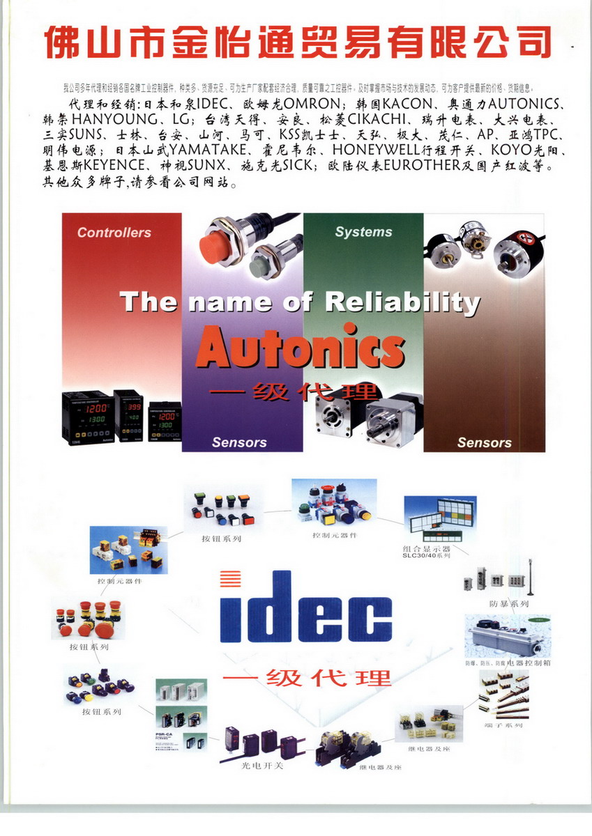 公司多年来代理的产品品牌有:韩国奥托尼克斯AUTONICS;日本和泉IDEC;台湾天得TEND;三实SUNS;安良ANLY;山河SHANHO;瑞升RISESUN;铨盛CHANGSHUAN;马可MACK;汉鼎AUSPICIOUS;凯士士KSS;明纬MEANWELL;伯吉PYJY;韩国建兴KOINO;三元IOLINK;经销:日本欧姆龙OMRON;施耐德SCHNEIDER;富士FUJI;TOCOS;竹中TAKEX;光阳KOYO;三菱MITSUBISHI;松下NATIONAL;神视SUNX;台湾士林SHILIN;台安TAIAN;阳明FOTEK;亚鸿TPC;锠钢PLT;松菱CIKACHI;韩国韩荣HANYONG;凯昆KACON;欧洲品牌:施克光SICK;劳易测LEUZE ELECTRONIC;西门子SIEMENS;伯恩斯坦BERNSTEIN;科瑞CONTRINEX;ABB等等。金怡通公司热切期待您的垂询或合作。