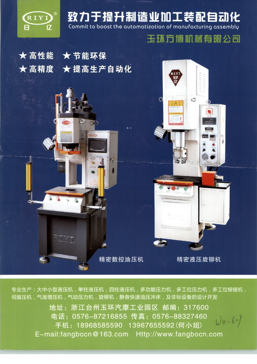 浙江玉环方博机械有限公司是一家专业致力于高速单柱液压机、数控单柱液压机、数控单臂液压机、数控小型压力机、中小型液压机、单柱液压机、单臂液压机、四柱液压机、数控液压机、精密液压机、全自动液压机、旋铆机,铆接机、铆钉机、小型压力机、四柱油压机、全自动油压机、弓形油压机、多功能液压机、通用液压机、多工位压力机、转盘式压力机、伺服压力机、伺服压装机、伺服冲床,电子压装机、伺服液压机、伺服油压机、电液伺服压力机、气液增压机、气动压力机、气动冲床、全自动旋铆机、油压冲床、数控油压机、油压拉伸机、及各种非标压力机的设计开发、制造与技术服务的高新技术企业。产品广泛使用于汽车零部件,家电,五金,橡胶,粉末治金等行业的装配-滚压-拉伸成形-弯曲-铆压-热压-压印等加工。本公司在引进德国、日本等国家先进的控制技术及机床设计理念的基础上,结合国内相关行业的实际需要,开发出各种台式、落地式全系列机床。液压密封件、气动密封件、电磁阀、液压缸等都选用国外知名企业品牌产品、部分选用国内品牌。控制系统选用德国西门子PLC、日本欧姆龙、法国斯耐德等知名品牌的电器元件,使设备性能更加稳定,操作方便。本公司机身等铸件采用精密铸造,高温处理、去应力退火、正火、自然时效处理等消除内应力,保证铸件性能,防止铸件变形和破坏,气动床身采用QT450球墨铸铁并经过各种必要的热处理保证铸件性能。本公司拥有一支专业从事专业机床设计、加工与维修服务的技术队伍,能够独立完成机械结构、电器与压力控制系统的设计;并应用现代优化设计理念与分析软件,进行受力分析和优化设计;能够自主完成产品的全部机械加工与组装调试,可以根据客户需要进行各种特殊的非标准机器与模具的设计和制作,产品生产周期短,并且提供运输、安装、调试等一条龙服务。本公司的产品曾出口美国,英国,法国,墨西哥,意大利,土耳其,日本,韩国,西班牙,德国,意大利,智利,埃及,泰国等等。玉环方博机械有限公司是压力机、中小型液压机、四柱液压机、油压机、气压机、增压机、旋铆机、多工位压力机、全自动压铆机等产品专业生产加工的有限责任公司(自然人投资或控股),公司总部设在浙江玉环汽摩配工业园,玉环方博机械有限公司拥有完整、科学的质量管理体系。玉环方博机械有限公司的诚信、实力和产品质量获得业界的认可。欢迎各界朋友莅临玉环方博机械有限公司参观、指导和业务洽谈。