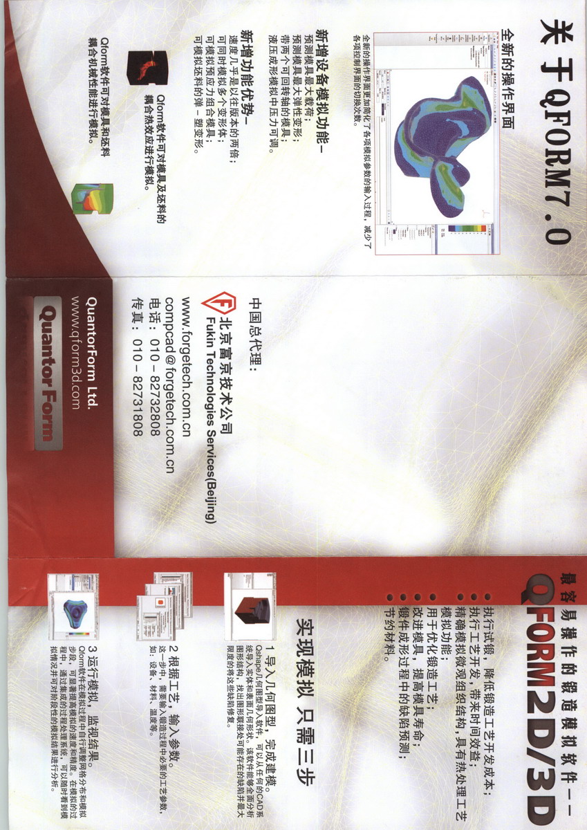 俄罗斯QuantorForm公司研发的锻压模拟软件 。目前发布的最新版本为VX8.1。² 完整的锻造工艺解决方案和完善的技术服务QFORM锻造模拟软件集成QFORM2D和QFORM3D模拟仿真于一身,提供了金属体积成形的完整锻造工艺模拟解决方案,帮助用户解决锻造工艺设计和优化,模具的设计制造等技术难题,通过模拟金属成型过程中出现的问题,改善并优化模具设计制造。QFORM锻造工艺模拟分析软件几乎涵盖金属体积成形的的锻造工艺:如自由锻、冷锻、温锻、热锻、粉末成形、镦锻成型、型材挤压、辊锻、楔横轧、轮辗、辗环等;并考虑模具寿命、热处理工艺、微观组织预测、工艺链全过程模拟分析;适合所有锻造材料(锻钢、锻铝、铜合金、高温合金)与设备的锻造工艺模拟分析,并包括完备的材料数据库和设备数据库。QFORM锻造工艺模拟分析适应的设备有液压机(锻造液压机、模锻液压机、挤压液压机)、机械压力机(曲柄压力机、热模锻压力机、平锻机、冷锻机)、锻锤(空气锤、液压锤、对击锤、多锤头压机)、螺旋压力机(摩擦螺旋压力机、电动螺旋压力机、液压螺旋压力机、离合式螺旋压力机)和旋转成形设备(楔横轧机、斜轧机、辗扩机、辊锻机、旋转锻造机)。