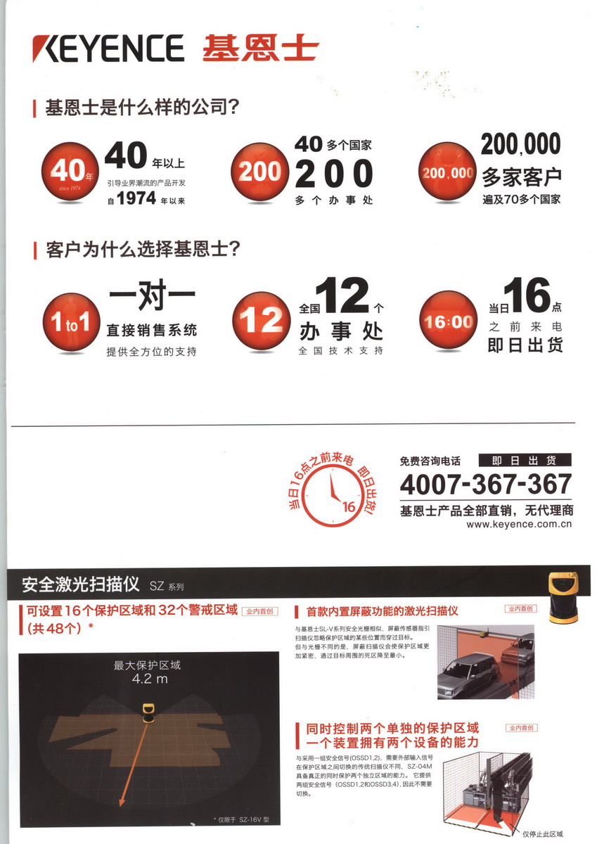 随着工业自动化方面的迅速发展,KEYENCE作为传感器和测量仪器的主要供应商,在不断开发制造更新、更可靠的产品,以满足各制造行业的需求。除高品质的产品外,在技术上训练有素的KEYENCE销售队伍还提供全方位的服务,从解决应用问题、技术销售支持到对用户的要求做出快速反应。KEYENCE一直致力于支持广大用户,并协助他们成为其行业中的佼佼者。