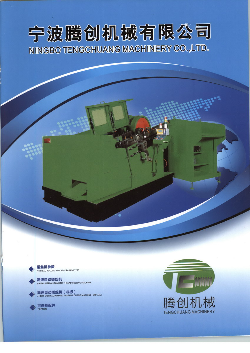 宁波腾创机械有限公司是中国腾龙集团旗下企业,公司位于宁波市北仑区小港街道,是一家致力于螺丝机的设计与生产的专业制造商。公司主要产品有高速自动搓丝机、华司组合机、一模二冲打头机、割沟机和割尾机。产品具有效率高,噪音小,能耗低,操作简便,使用寿命长等特点。产品规格齐全,可制M1~M38等各规格螺丝,特别针对空心、加长、无头及不锈钢等复杂异形件成型机制造有丰富的经验,可增加用户产品的附加价值。最先进的设备、最前沿的工艺、最丰富的零件实际生产经验,是用户给予信任和支持的信心来源。公司积聚多年螺丝机研发制造经验,拥有年轻的设计与生产的专业团队以及核心的技术力量,致力于为用户提供系列化、多品种、高性价比的产品与完善的售后服务,为用户创造市场核心竞争力,获得最大的投资回报是我们追求的目标,真诚期待与您的交流与合作!搓丝机优势:生产速度快、模具消耗低、产品附加值高、高品质零部件、安全、无污染、根据产品的多样性提供特殊设计、调试方便,获得最大的机器效率、为客户规划整厂设备自动上料、集中供油系统。