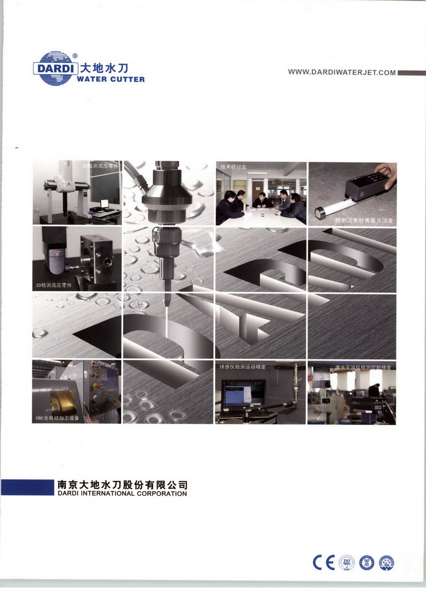 南京大地水刀股份有限公司是目前中国居于领先地位、具有全球影响的一家专业从事超高压水射流技术应用产品研发、生产、销售及技术服务的高新技术企业。公司主产品“超高压数控万能水切割机”,又称“水刀”,是世界上最新的冷切割新工艺和先进制造装备。它兼有机电一体化、超高压及水射流技术与CNC自动化、自动检测与补偿、计算机辅助设计和制造、机器人应用等诸多领域的高新技术,是具有世界水平的高科技产品。“水刀”以其“无所不能”的特质又称“神奇水刀”。其独特冷切割工艺和精细加工的优良品质随着新型制造业的需求和新材料应用领域的飞速拓展,已为愈来愈多的行业所采用。以大地水刀为首的中国水刀已成为面向世界市场的新型装备产业,而大地水刀以其最具性价比优势已成为世界知名品牌。大地水刀凝聚多年研发、生产,约2000家用户的经验与技术沉淀,拥有与超高压数控水切割机、超高压水清洗相关的专利四十余项。主编中国第一部《超高压水切割机》行业标准和国家标准。大地公司生产的“400MPa超高压水切割机”荣获江苏省机械装备行业首届专利新产品金奖、江苏省机械工业科技进步一等奖;DWMC水切割加工中心获国家级重点新产品、江苏省高新技术产品称号,获南京市科技进步一等奖;并于2009年承担“江苏省科技成果转化项目”。公司超高压数控万能水切割机已实现系列化、批量化生产,并通过ISO9001和CE认证。“超高压数控万能水切割机”被认定为江苏省、南京市名牌产品,“大地”商标也被认定为江苏省、南京市著名商标。公司产品不仅在国内销售领先,且远销美国、加拿大、中东、东南亚等三十多个国家和地区,迄今已有约2000台公司生产产品在电力及新能源、石化、高铁、汽车、医疗、纺织、食品、化工、印刷、包装、工程机械、船舶修造、电子、交通、建筑、装潢装饰;金属、碳纤维、玻璃纤维、化纤、皮革、塑料、布匹、纸张、玻璃、陶瓷、石材等广阔的领域使用。