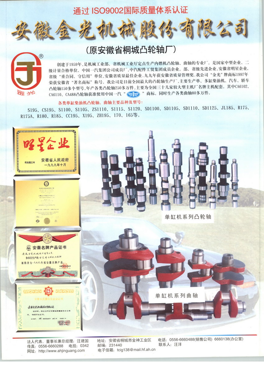 安徽金光机械股份有限公司是集研制、开发、生产、销售于一体的国内最大的凸轮轴、曲轴、气门等内燃机零部件专业公司,现为国家中型企业,中国机械500强企业,全国技术创新示范单位,安徽省高新技术企业,安徽省明星企业,部级、省级先进企业,省质量最佳企业,省质量管理奖单位,计量检测体系二级确认合格企业,农行“aaa”级资信单位,省级“诚信纳税企业”,省级“重合同,守信用”单位,中国汽配工贸集团企业,iso9001:2000质量管理体系认证企业,是具有自营进出口权资格企业。 公司占地面积25万平方米,其中建筑面积8.5万平方米,总资产1.5亿元,其中固定资产1.2亿元,拥有各类主要设备600台(套),公司现有六部、十三个车间、十二个科室,公司现有员工1200余人,其中各类中、高级专业技术人员280余人。公司拥有现代化的凸轮轴、曲轴和气门生产线,并从德国和美国分别引进了具有国际先进水平的cnc全数控凸轮轴加工、检测中心。公司建有“省级技术中心”和cad工作站,拥有国内一流的科研开发人才队伍。多年来,企业不断加快新产品的研发和技术创新,推进名牌战略的实施,积极运用现代企业制度,加强企业各项管理,各项经济技术指标均名列全国同行业前茅,正跨入规模经营、规模效益的发展阶段。