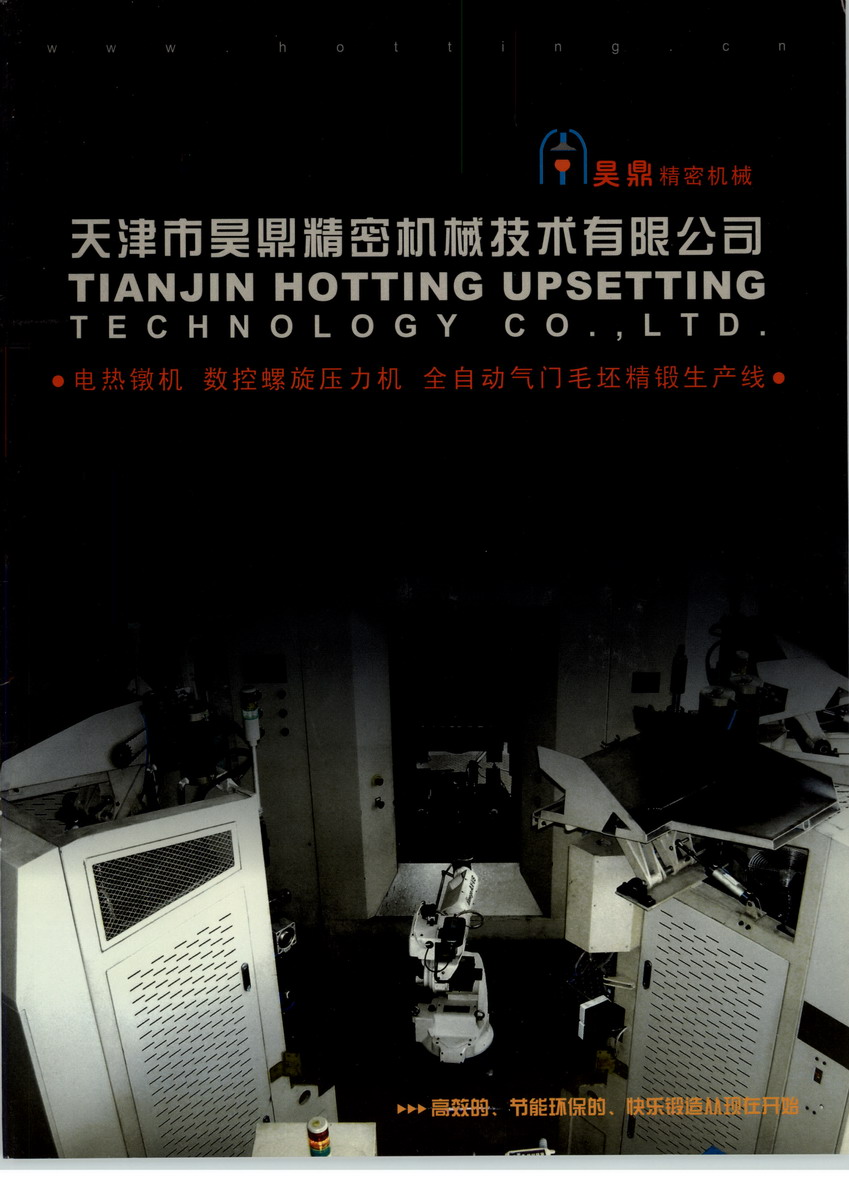 天津市昊鼎精密机械技术有限公司(HOTTING),座落在天津市新技术产业园区,其基础依赖于其全体员工不断创新求实的思想和严谨的科学态度.HOTTING公司与天津大学、河北工业大学及众多技术研究机构组成合作小组,迅速将客户的需要和要求转化成专门设计的设备。客户的需要至高无上。 HOTTING公司在机械设计与制造和液压、气动及电气自动化控制方面具有较强的实力,并凭借丰富的实践经验,先后为天津丰田发动机厂、天津星光橡塑厂(丰田合成)、德国SEW减速机厂等公司,完成关键设备的制造及原有设备的技术改造等。 HOTTING公司生产的电镦机是金属热成型的理想设备。昊鼎公司遵循“满足客户,度身制造”的信念,为您提供恰到好处的设备。我们热切希望并欢迎您到天津来我公司光临指导!