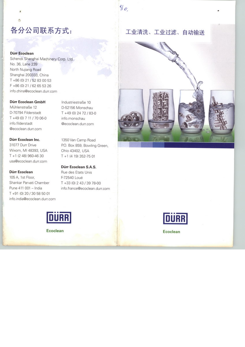 杜尔Ecoclean集团是工业清洗,自动传送和过滤系统领先的解决方案提供者,面对全球汽车行业极其他们的配套供应商极其更加广泛的市场提供创新的标准系统,客户订制的解决方案和服务。杜尔Ecoclean作为杜尔集团的一员,已经在德国,法国,捷克,美国,中国和印度拥有自己的工厂和办事机构。杜尔集团活跃在全球市场的供应商并在其专业市场占据领先位置。汽车行业的业务约占总销售的85%. 杜尔也为航空航天,工程机械,化工和制药行业提供创新的制造和环境技术。杜尔集团通过两个分支来运营管理。涂装系统主要主要提供生产和喷涂技术,主要应用在汽车的车身和汽车汽车底盘生产制造方面。于此同时,测量和加工系统体为发动机和传动装置的生产和车辆的最终装配服务。 在全球21个国家47个城市分布着杜尔的公司机构。